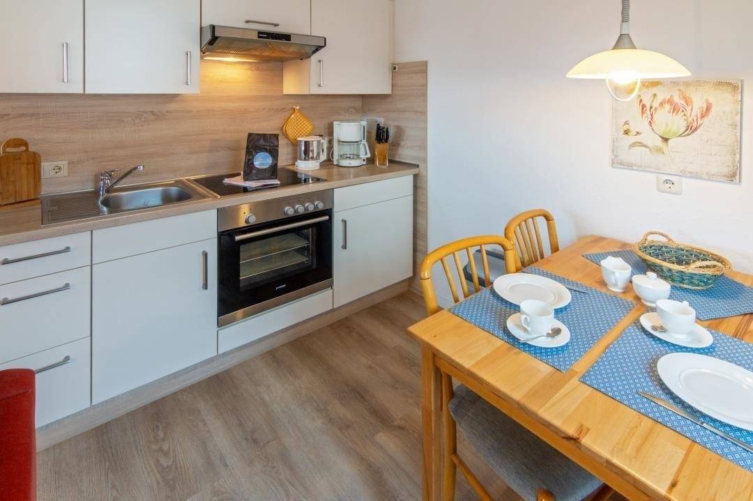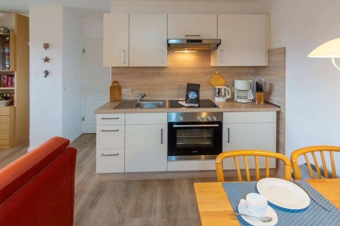 Im Wohnbereich findest du ein bequemes Sofa mit Schlaffunktion und einen dazugehörigen Sessel, die zum Verweilen einladen. Für Unterhaltung ist gesorgt: Die Wohnung verfügt über Internet und WLAN, einen TV, ein Radio, einen DVD-Spieler sowie eine Auswahl an Büchern und Spielen. Die Küche ist offen zum Wohnzimmer gestaltet und mit modernen Geräten ausgestattet, darunter ein Ceran-Herd, ein Gefrierfach/-schrank, eine Espressomaschine, eine Mikrowelle, ein Kühlschrank, eine Kaffeemaschine, ein Wasserkocher, ein Mixer, ein Toaster und ein Eierkocher. Geschirr und Besteck, Geschirrhandtücher, Gewürze und ein Abfalleimer sind ebenfalls vorhanden.