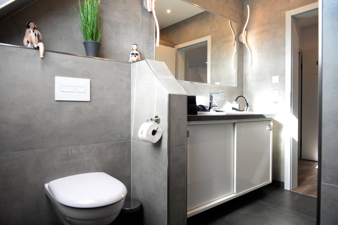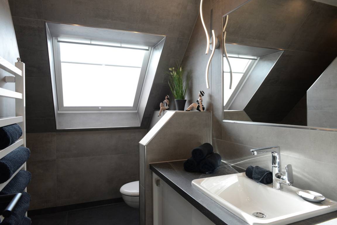 Das moderne Badezimmer mit Veluxfenster verfügt über eine bodenebene Dusche, einem WC, eine Waschtischkombination mit großem Spiegel, Föhn usw.