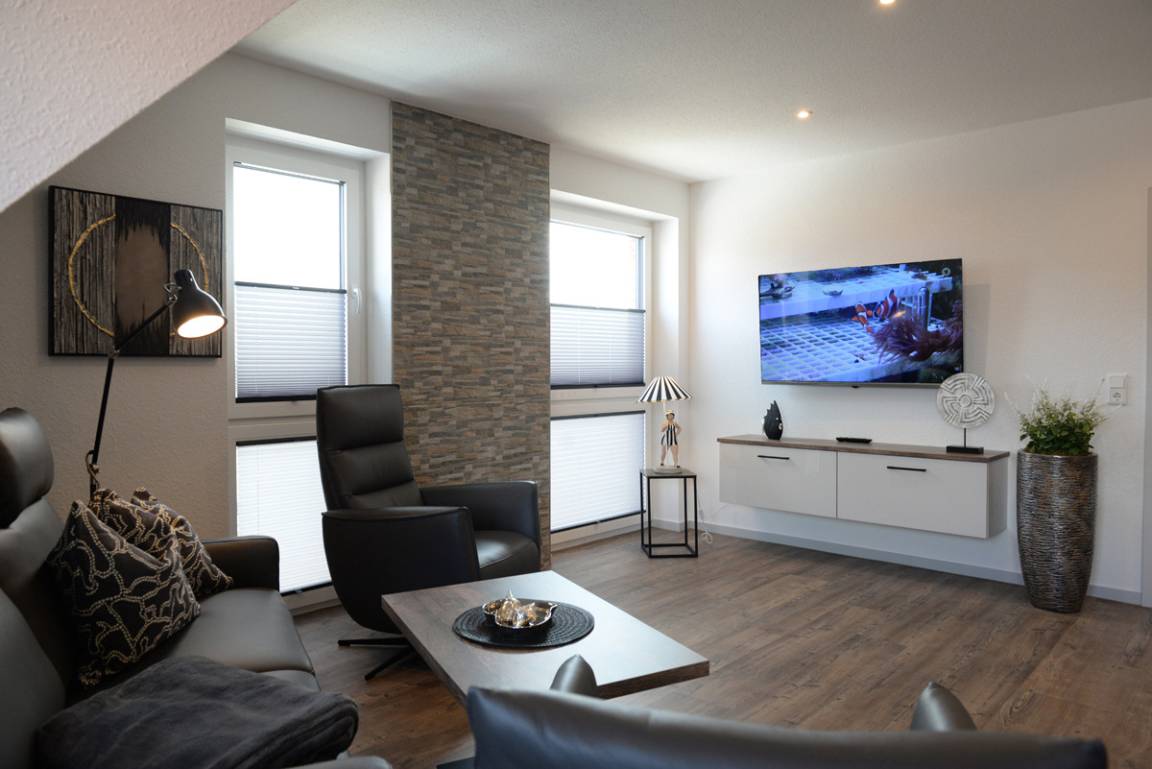 Die Ferienwohnung Deichdeck 3 OL für 2 Personen befindet sich im 1. OG eines neu erbauten Ferienhauses mit insgesamt 4 Ferienwohnungen in Norddeich. Die Wohnung liegt in einer zentralen und sackgassenähnlichen Lage. Das Wohn/Esszimmer ist mit einer gemütlichen Couch u. 2 Sessel, einem Flachbildschirm-Fernseher, einer Essgruppe und einer voll ausgestatteten Einbauküche eingerichtet. Von dort aus gelangen Sie auf einen Balkon, der mit Gartenmöbeln und einem Sonnenschirm ausgestattet ist. Dieses Plätzchen lädt Sie zum Sonnenbaden oder für den späteren Sonnenuntergang am Abend ein.