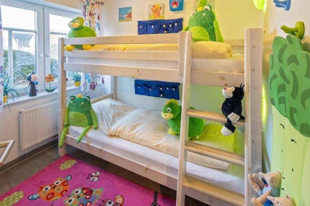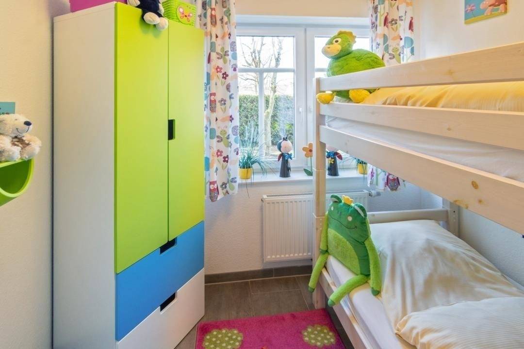 Das zweite Schlafzimmer ist hell und kinderfreundlich gestaltet und mit einem Doppelstockbett und einem Kleiderschrank ausgestattet. Zusätzliche Leselampen spenden genügend Licht für die abendlichen „Gute-Nacht-Geschichten".