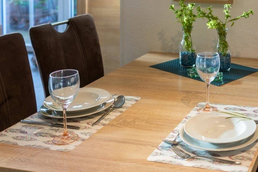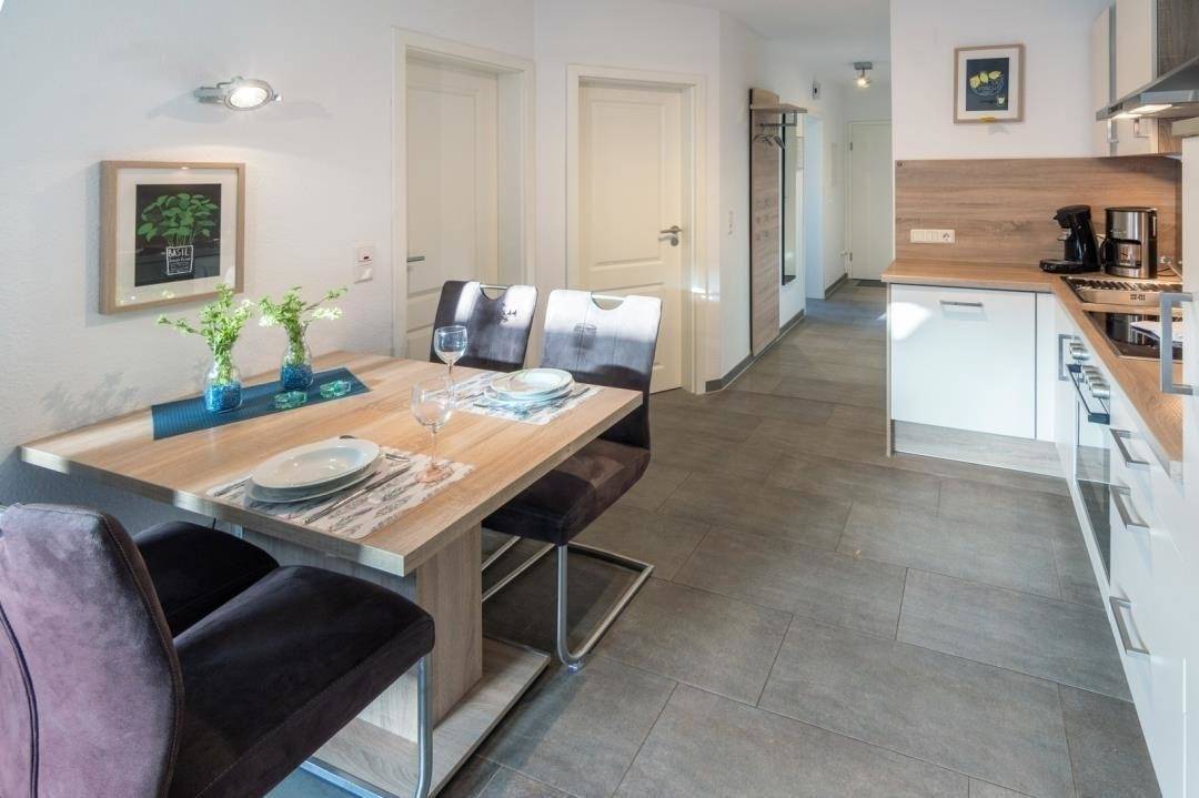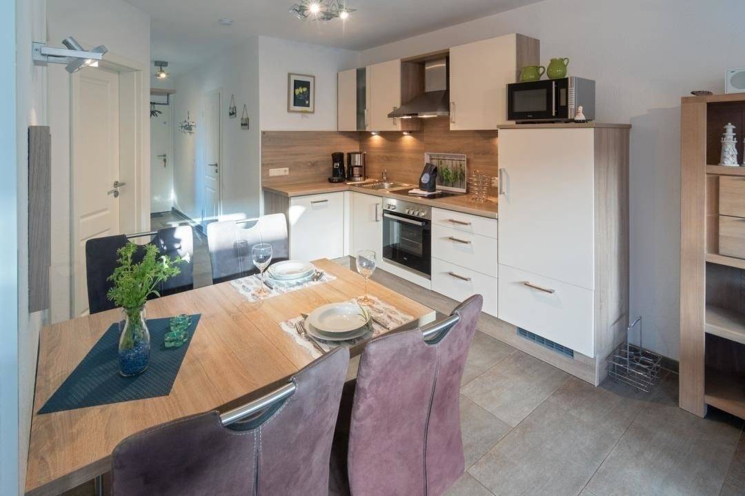 Die moderne Eckküche ist bestens ausgestattet und lässt sicherlich keine Wünsche offen. Ein 4-Platten-Herd, ein Backofen, eine Mikrowelle, ein Kühlschrank, eine Pad-Kaffeemaschine und ein Toaster sowie ausreichend Geschirr und Gläser stehen hier zu Ihrer Verfügung. Der Esstisch mit seinen vier Stühlen lädt zu gemeinsamen Mahlzeiten, Spieleabenden oder anderen gemeinschaftlichen Beschäftigungen ein. Sollten Sie ein Kleinkind zu Ihrer Familie zählen, finden Sie in der „Kleinen Auszeit" ebenfalls einen Kinder-Hochstuhl.