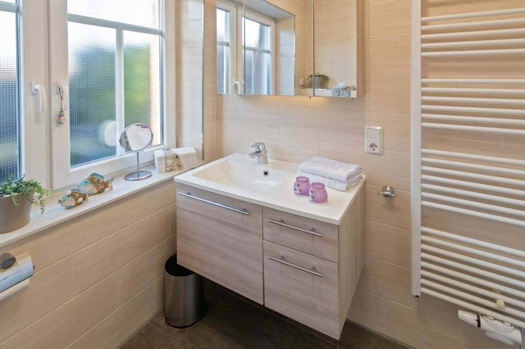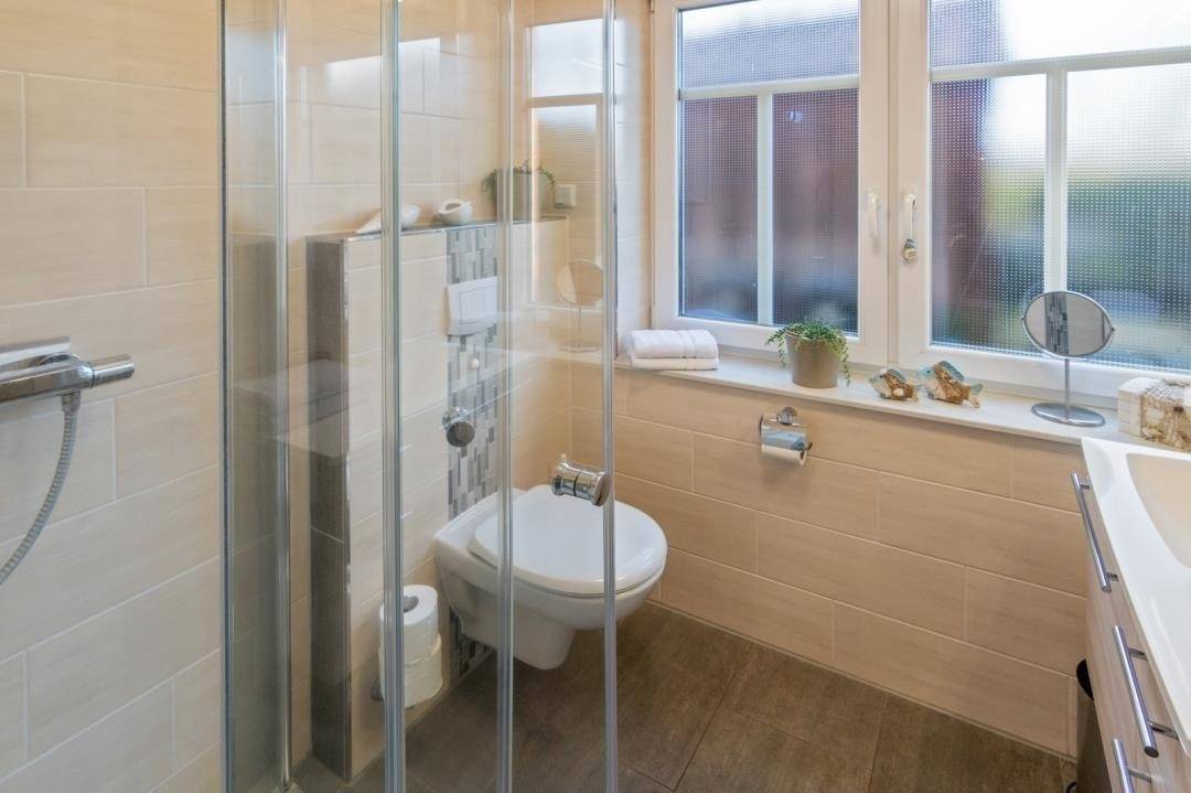 Das vorhandene Tageslicht-Badezimmer mit WC ist durchgehend gefliest, verfügt über eine bodennahe Dusche und wird mit einer Handtuchheizung geheizt. Für genügend Stauraum sorgt der Schrank unter dem Waschbecken. Als Extra finden Sie einen Föhn und einen Kosmetikspiegel vor.