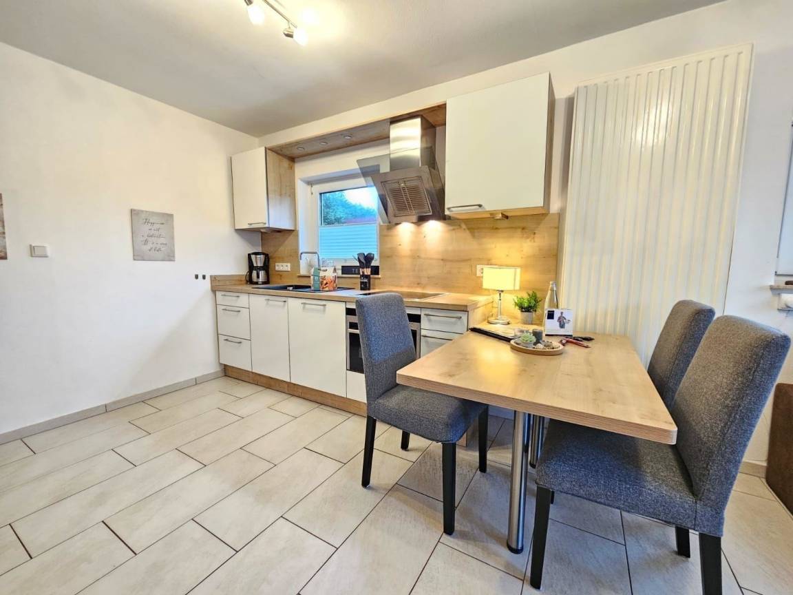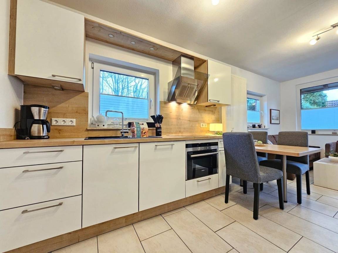 Die Ferienwohnung Boppo im Mienhus in Norddeich bietet einen komfortablen und modernen Rückzugsort. Der lichtdurchflutete Wohnbereich mit offener Wohnküche ist vollständig ausgestattet mit Ceranfeld, Backofen, Kühlschrank mit Gefrierfach und Küchenutensilien für eine unkomplizierte Selbstversorgung. Ein Esstisch für vier Personen und eine gemütliche Sofaecke laden zum Verweilen ein. Das Schlafzimmer gewährleistet erholsame Nächte, während das helle Bad mit Fenster modernen Komfort bietet.