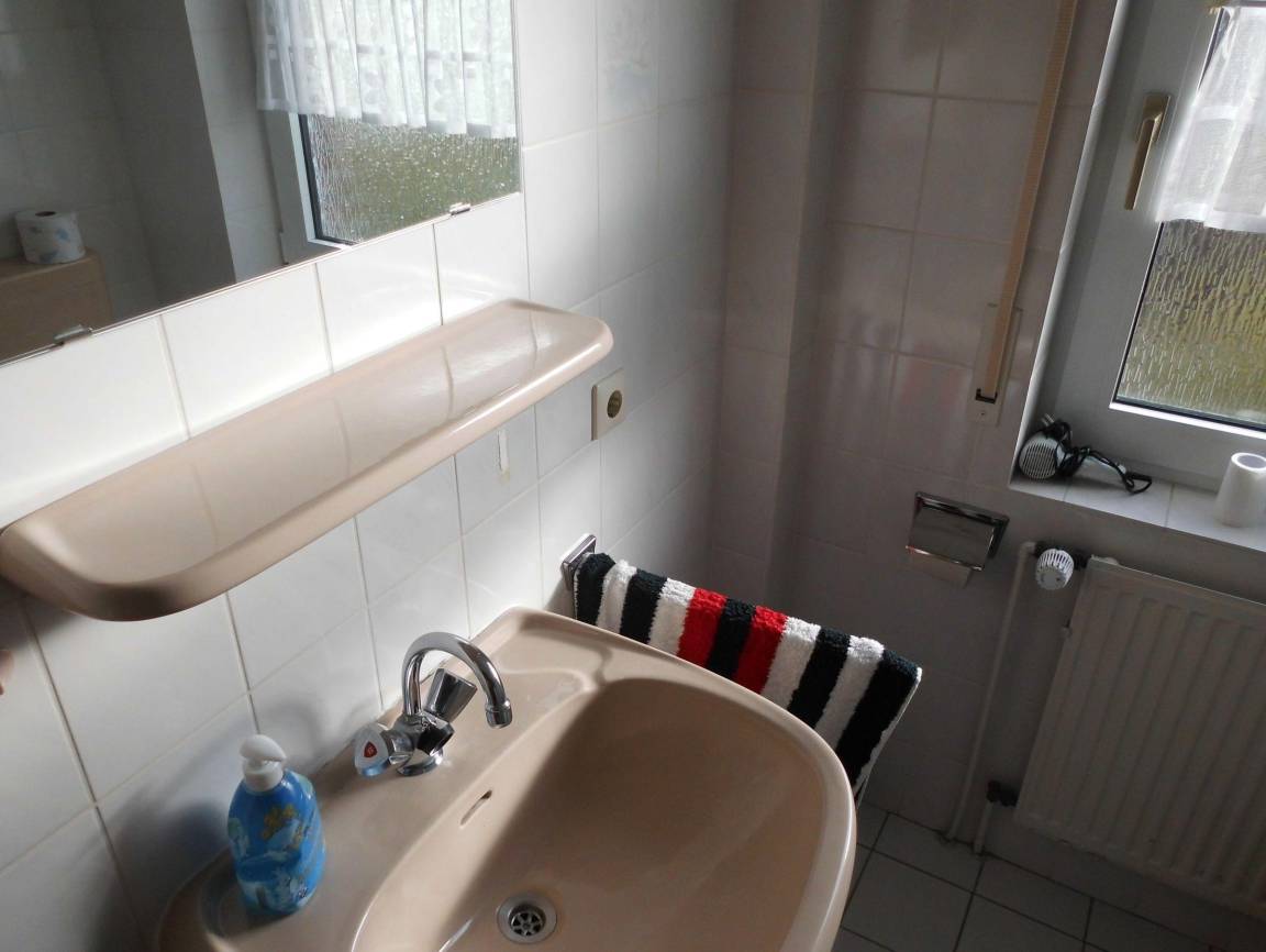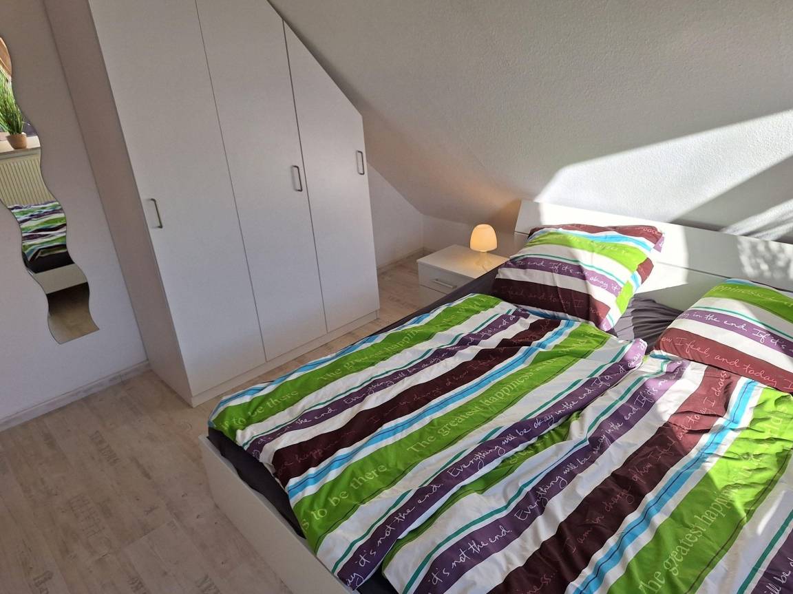 Die moderne Ferienwohnung im ersten Obergeschoss eines Mehrfamilienhauses bietet Platz für bis zu vier Personen. Der großzügige Wohn- und Essbereich ist mit einer Sofagarnitur und einem Kabel/Smatrt TV ausgestattet. Die offene Küche umfasst ein Cerankochfeld, einen Geschirrspüler, Backofen, Kühlschrank mit Gefrierabteil sowie alle notwendigen Küchenutensilien. Das Schlafzimmer verfügt über ein Doppelbett (1,80 x 2 m) und einen Einbaukleiderschrank. Im oberen Bereich finden sich zwei Einzelbetten (Futon 1,40 x 2 m) sowie eine Waschmaschine. Das Badezimmer ist mit einer Dusche, WC, Spiegel und Waschbecken ausgestattet. Zur Wohnung gehören ein PKW-Stellplatz, kostenfreies WLAN und ein gemeinschaftlicher Fahrradraum. Bettwäsche und Handtücher sind nicht inkludiert, können jedoch kostenpflichtig hinzugebucht werden. Hunde sind willkommen, Katzen sind nicht gestattet.