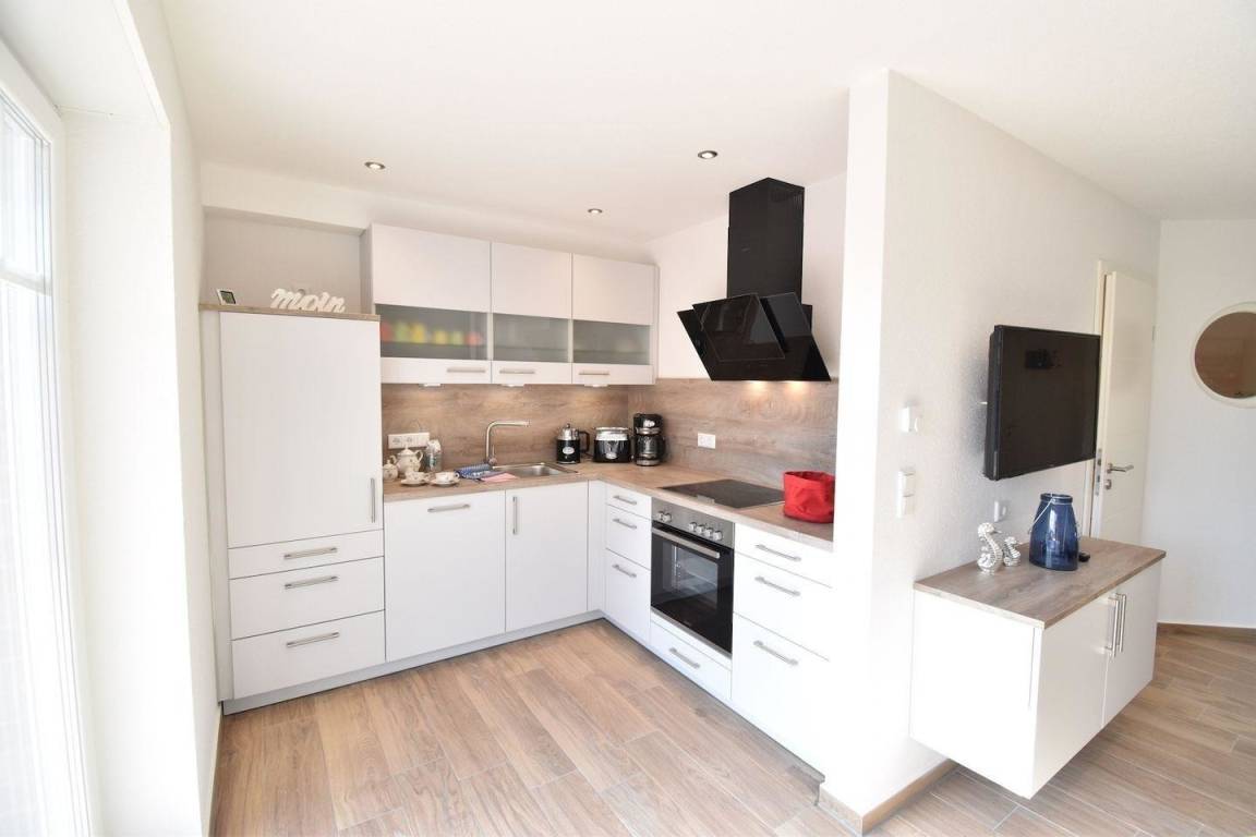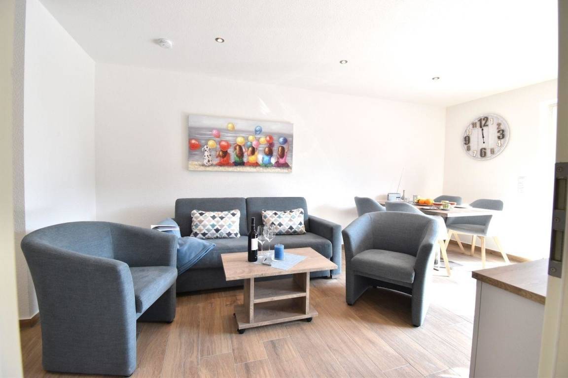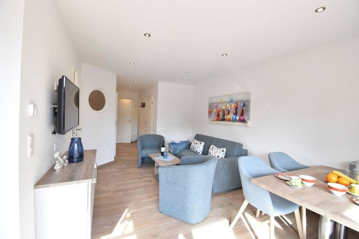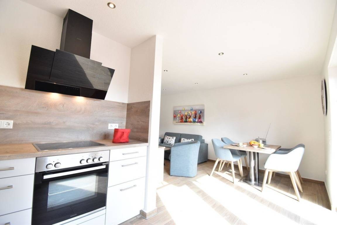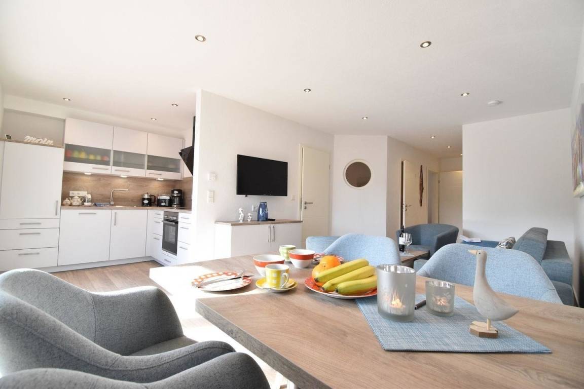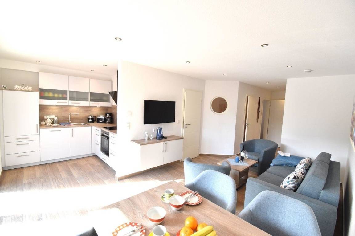 Der offene Koch -und Wohnbereich ist hell und modern eingerichtet und bietet eine Küchenzeile, einen schönen Essbereich und den angrenzenden Wohnbereich mit Sofa und Sessel zum Entspannen.