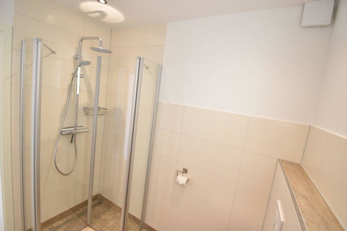 Das Bad mit bodentiefer Dusche, WC und Waschtisch rundet den Grundriss ab.