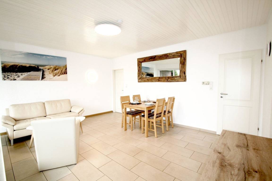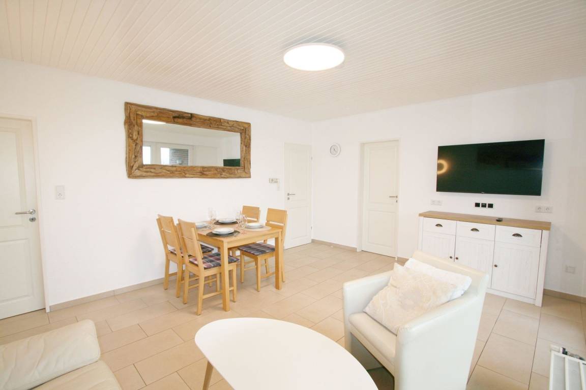 Der strandnahe Bungalow in Norddeich bietet auf ca. 65 m² ausreichend Platz für bis zu 4 Personen, inklusive eines Familienhundes. Der Eingangsbereich führt in ein großzügiges Wohnzimmer, das geschmackvoll mit einem 4K Smart-TV und einem Rolf Benz Ledersofa eingerichtet ist.