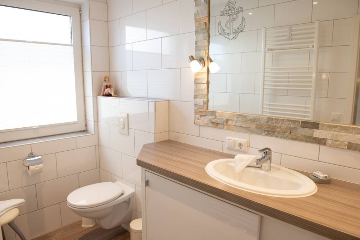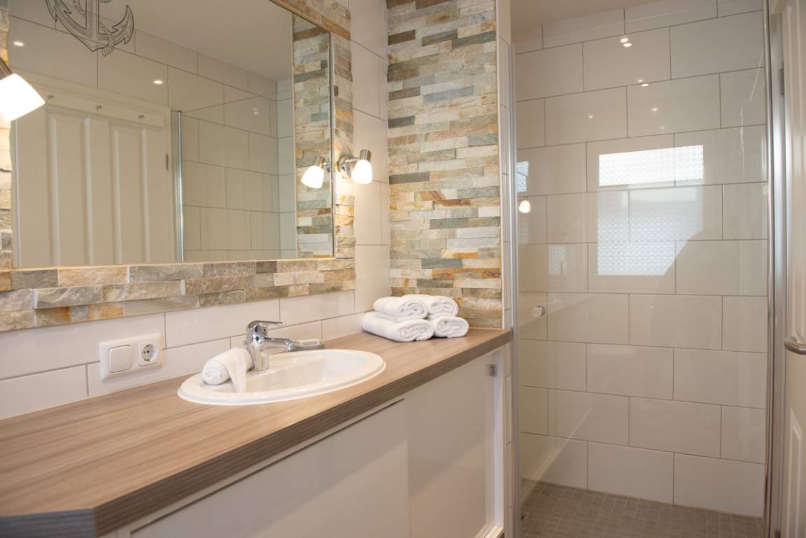 Die großzügige Ferienwohnung Mitschip erstreckt sich über zwei Etagen und bietet zwei separate Schlafzimmer im 1. Obergeschoss, eines davon mit Außenrollläden und Sat-TV. Zusätzlich steht Ihnen dort ein separates WC zur Verfügung. Das moderne Badezimmer ist mit Tageslicht, einer bodenebenen Dusche und einem Handtuchheizkörper ausgestattet.