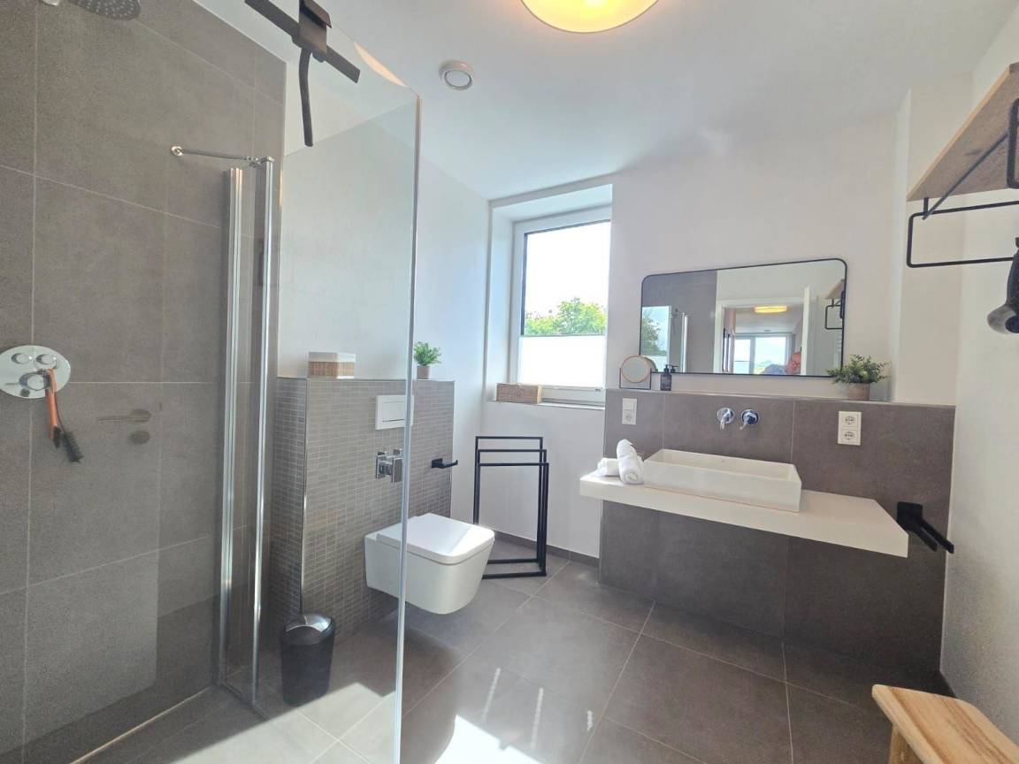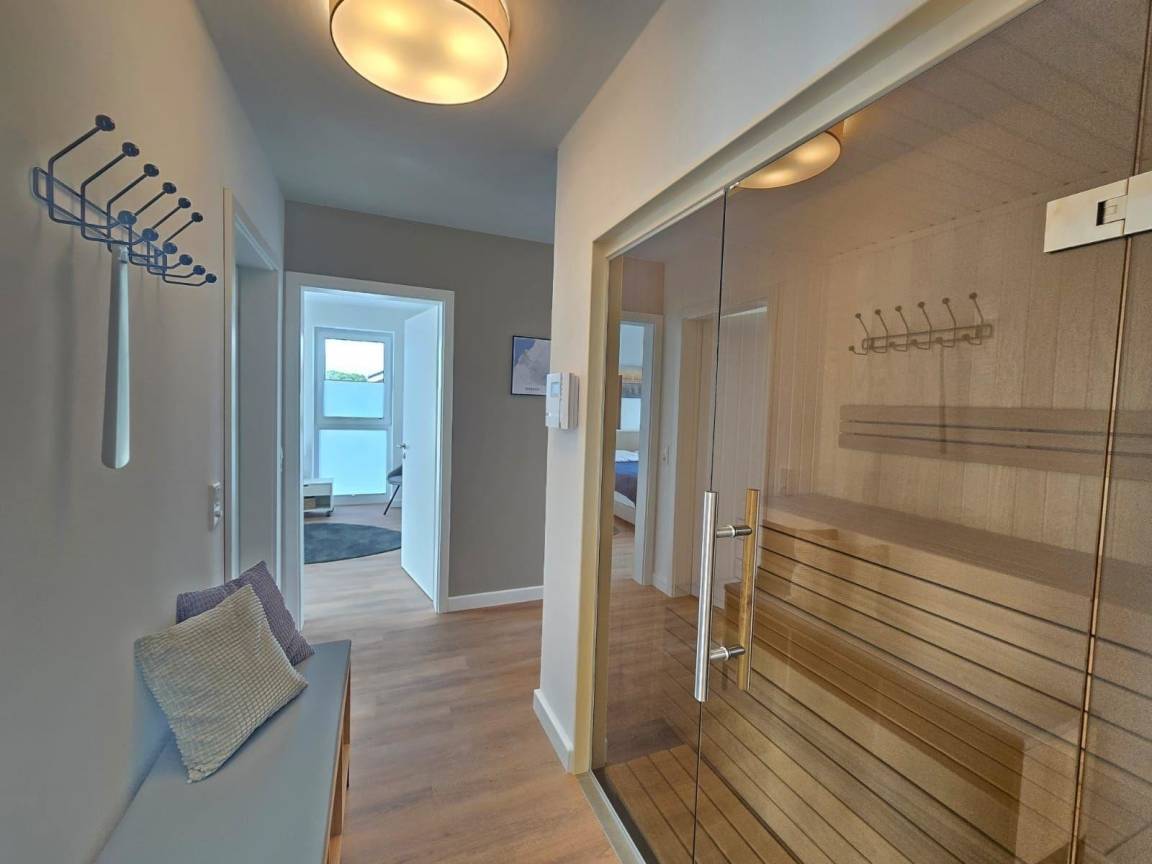 Die Ferienwohnung Hafenblick in Norden bietet auf 96 m² modernen Wohnkomfort für bis zu 6 Personen. Große Fensterfronten durchfluten die hellen Räume mit Tageslicht und schaffen eine freundliche Atmosphäre. Der stilvolle Wohnbereich mit bequemen Sitzmöbeln lädt zum Entspannen ein. Die Unterkunft verfügt über eine moderne Küche, die mit allen nötigen Geräten ausgestattet ist, sowie ein helles, zeitgemäßes Badezimmer. Ein Highlight ist die private Sauna, ideal zum Entspannen nach einem Tagesausflug. Haustiere sind willkommen. Für zusätzlichen Komfort sorgen ein Fahrstuhl und ein privater Parkplatz. Zudem steht ein gemeinschaftlicher Fahrradraum mit Ladestation für E-Bikes zur Verfügung. Die Lage an der Norder Marina ergänzt das Angebot durch maritime Erlebnisse und gute Erreichbarkeit von Geschäften und Restaurants.