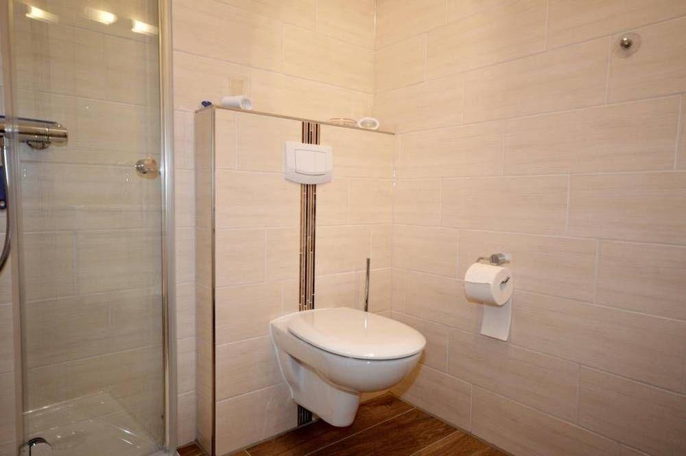 Das neue Dusch-Bad lädt zum Verweilen ein. Ein Kosmetikspiegel steht zur Verfügung - ebenfalls ein Fön.