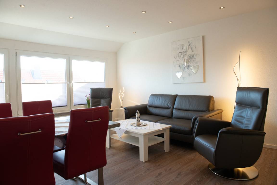 Im Wohn - Essbereich mit Tisch und 4 Stühlen sowie einer gemütlichen Couch, zwei Relax-Sessel und Sat/TV mit Flachbildschirm können Sie entspannt relaxen und der Balkon lädt zum Sonnenbaden ein. Die Küche ist getrennt vom Wohnbereich und hält alle Kochutensilien für Sie bereit.