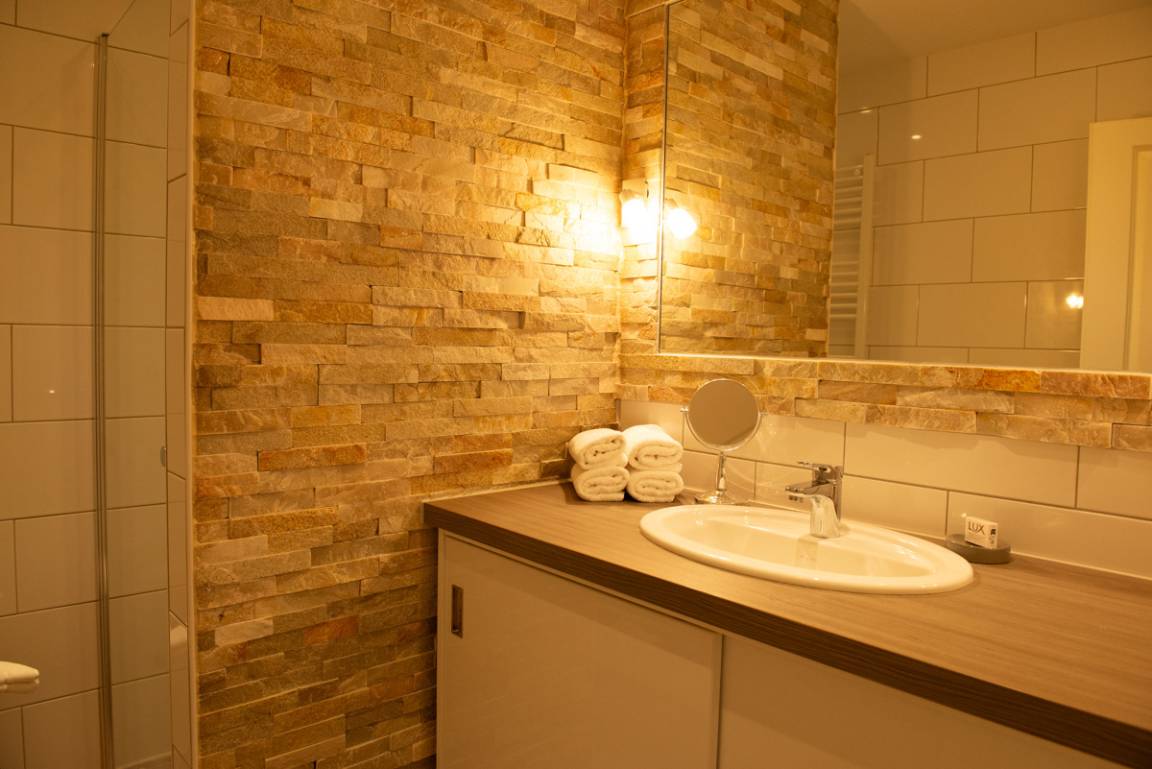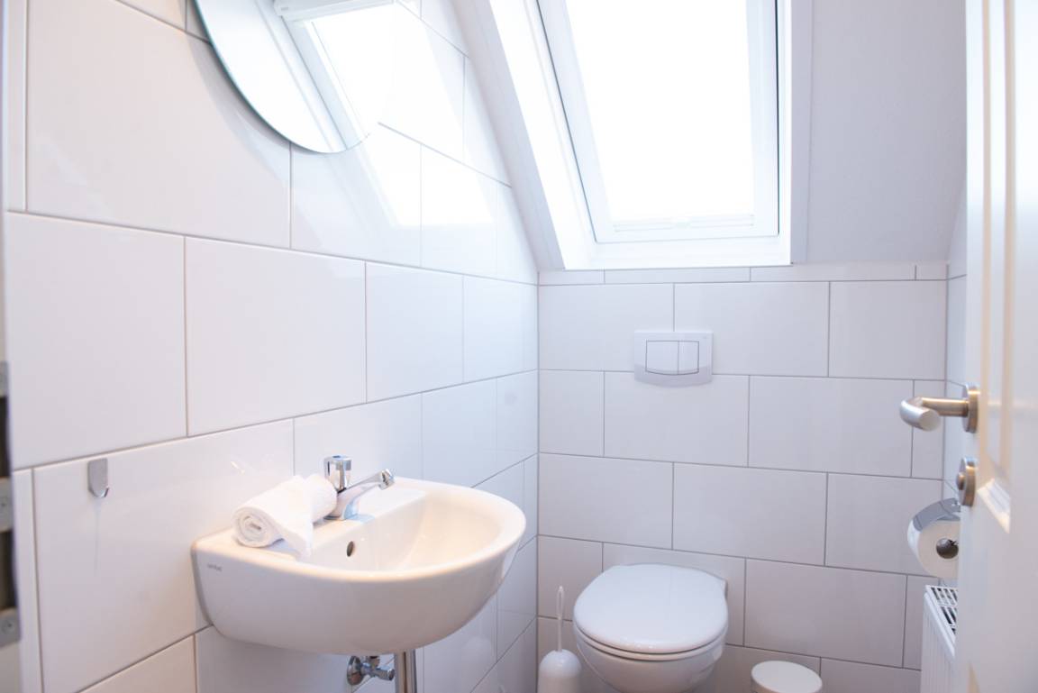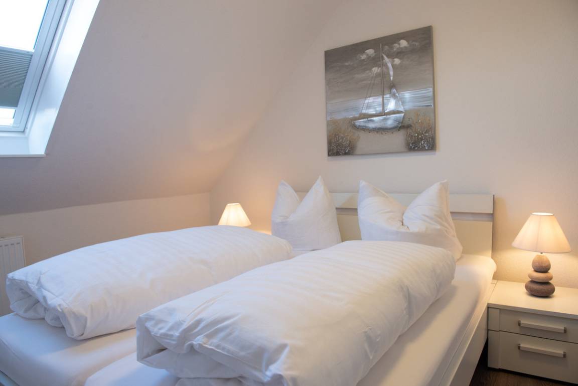Die Ferienwohnung Santa Maria liegt im 2. OG und verfügt über zwei getrennte Schlafzimmer, die mit Veluxfenstern + Verdunklungs - Plissees ausgestattet sind. Das moderne Bad ist mit einem Veluxfenster, einer bodenebenen Dusche und einem Handtuchhalter - Heizungskörper ausgestattet. Das WC ist separat.