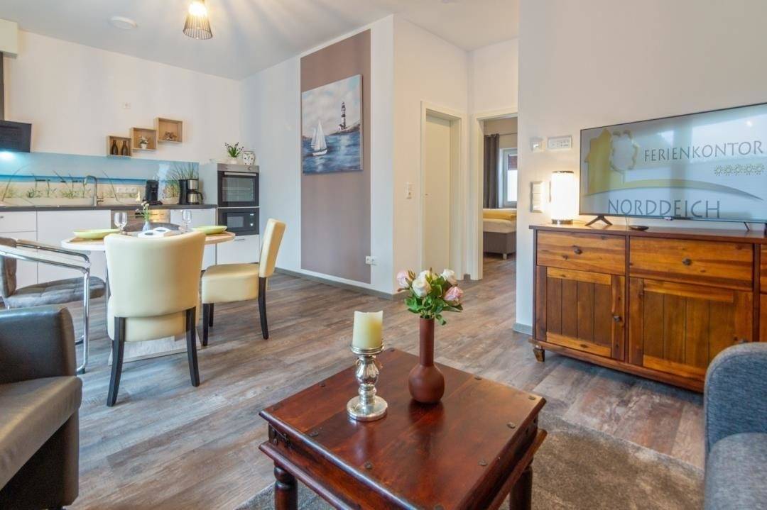 Zum Strand ist es nicht weit: Ihr Spaziergang führt Sie kurz über den Deich an die schöne Nordsee. Ebenso schnell gelangen Sie in Zentrum Norddeichs. Ihr Apartment ist optimal gelegen, um sowohl die Naturschätze genießen zu dürfen als auch am regen Treiben des kleinen Touristenörtchens teilzunehmen.