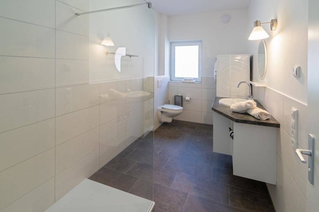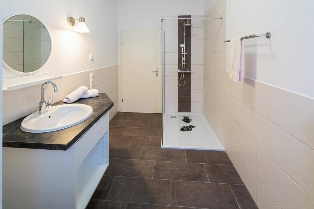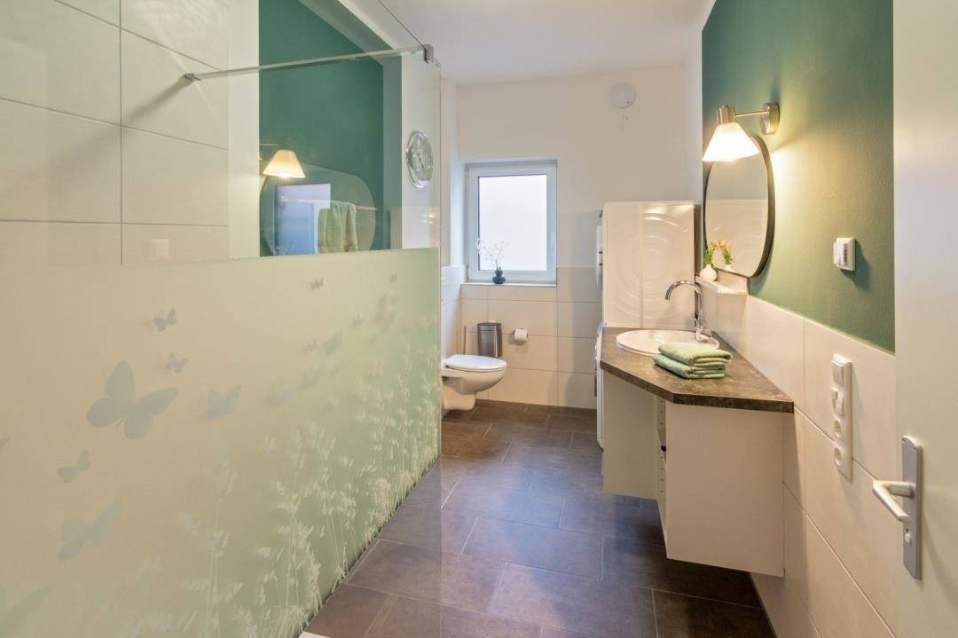Das große Badezimmer hat ein Fenster, eine bodennahe Dusche, WC + Spiegel mit Unterschrank.
