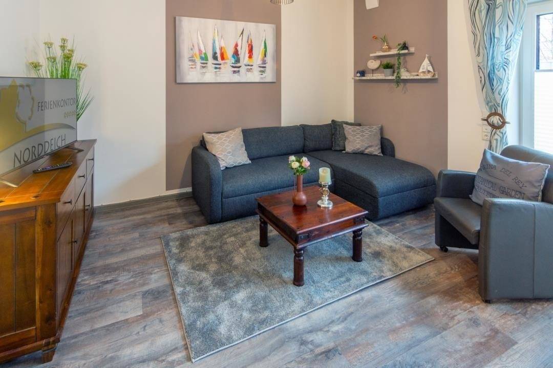 Auf Norddeichs Hauptstrasse, der Norddeicherstrasse, gelegenes Mehrparteienhaus. Im Erdgeschoss ist ein Geschäftslokal. Der Parkplatz ist hinterm Haus. Die Terrasse liegt seitlich am Haus. Der Eingang zur Wohnung ist ebenerdig und direkt vom Parkplatz aus
