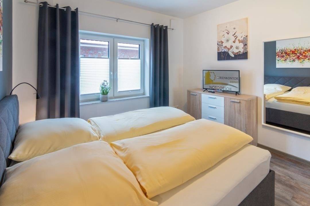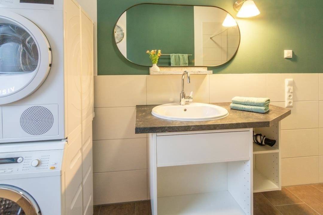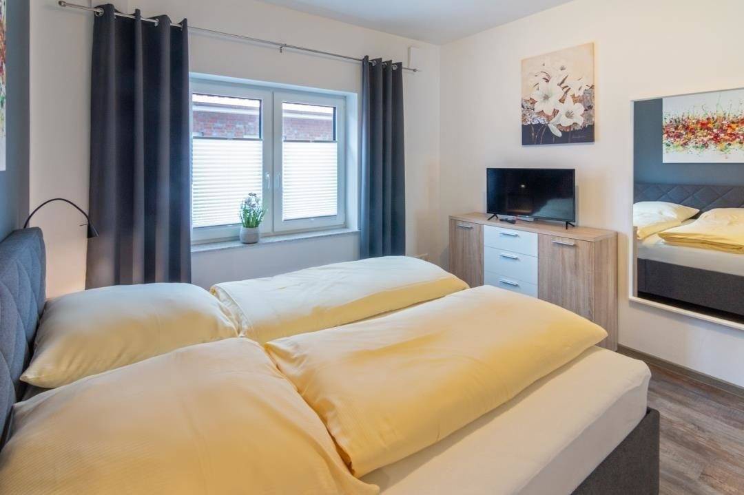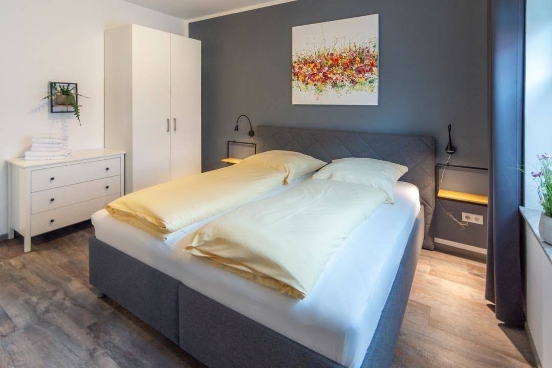 Das Schlafzimmer verfügt über ein modernes Doppelbett. Kommode, Schrank und Sessel ergänzen das Mobiliar. Besonders wohl dürfen Sie sich in dem großzügig angelegten und schick gefliesten Badezimmer fühlen. Die Dusche ist ebenerdig und bietet viel Bewegungsfreiheit. Darüber hinaus sind sowohl Waschmaschine als auch Trockner vorhanden.
