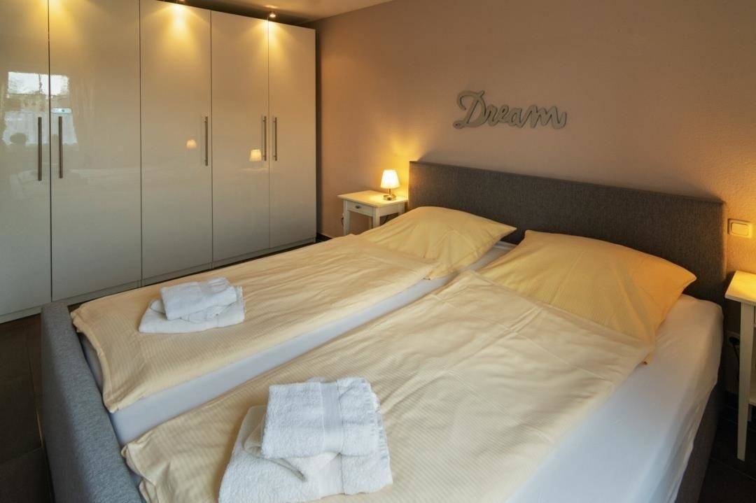 Der separate Schlafraum wurde mit einem einladenden Doppelbett möbliert. Zwei Nachttische sowie ein Wecker/Radiowecker und passende Nachttischlampen runden das Bett stimmig ab. Selbstverständlich steht Ihnen zudem ein Kleiderschrank mit genügend Kleiderbügeln zur Verfügung.