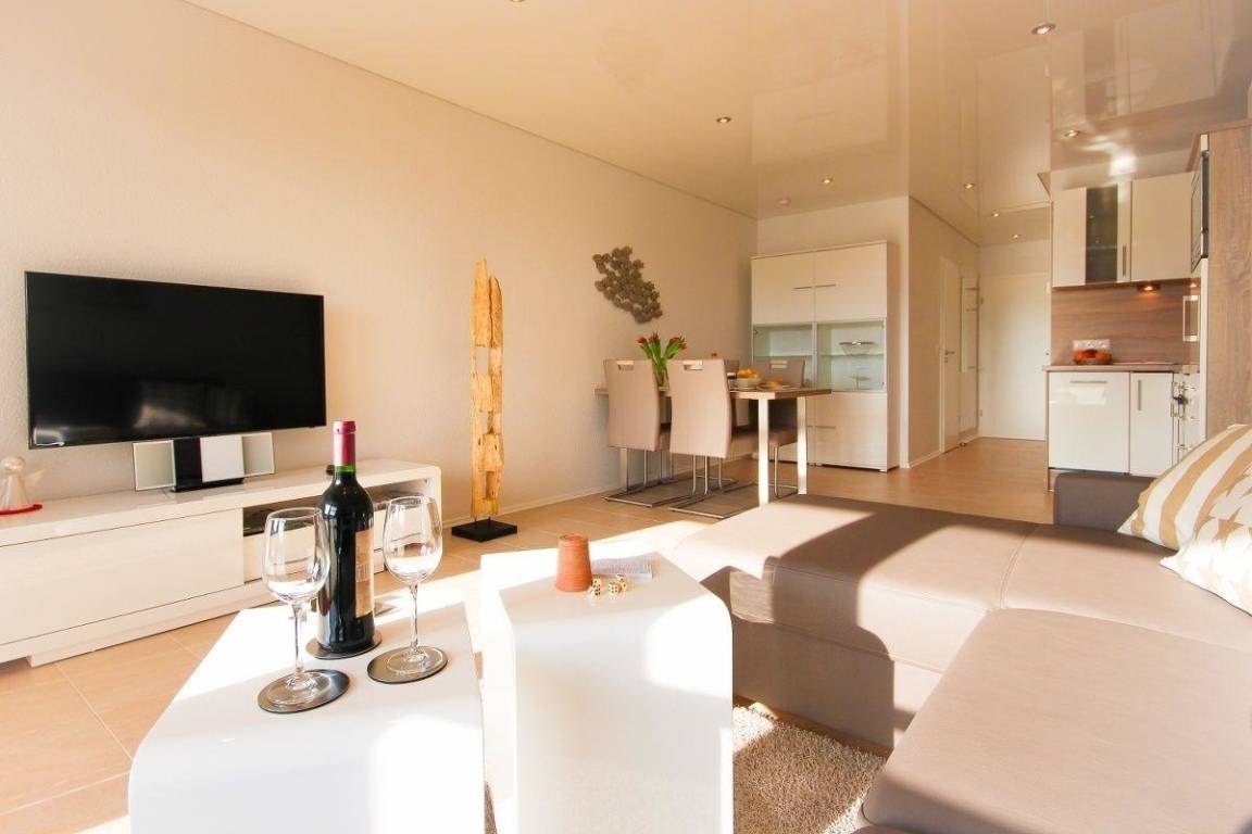 Die Ferienwohnung verfügt über eine moderne großzügige helle Wohnküche mit folgenden hochwertigen Ausstattungsdetails: Ceranfeld, Backofen, Spülmaschine, Kühlschrank mit Gefrierfach, Mikrowelle (alles von Neff), Toaster, Wasserkocher, Eierkocher, Senseo -Kaffeepadmaschine und Kaffeemaschine.