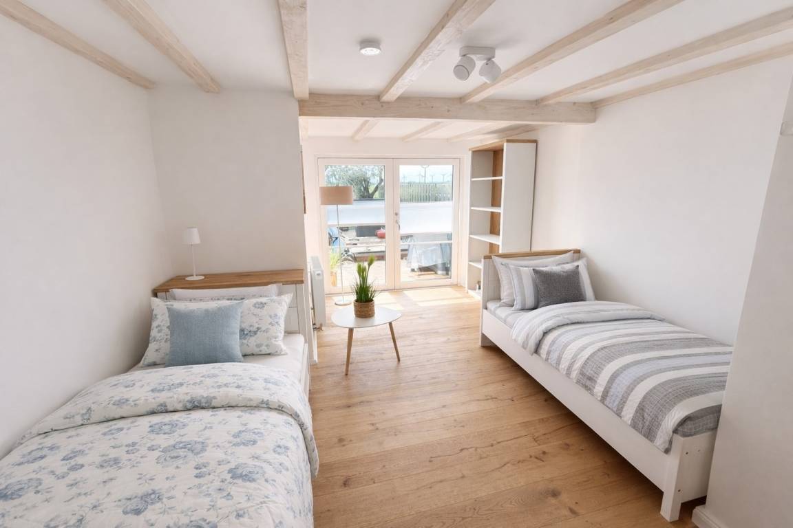 • ein Schlafzimmer mit zwei Einzelbetten und Regal