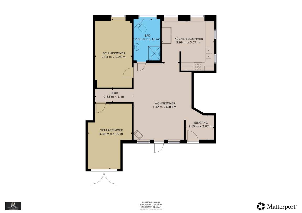 Die gesamte Wohnung befindet sich ebenerdig im Erdgeschoss. Das Dachgeschoss ist nicht zugänglich und wird ausschließlich als Wäschelager genutzt.