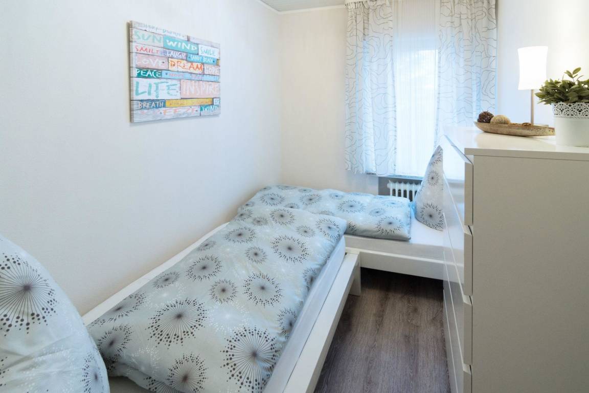Das moderne Ferienhaus in Norddeich bietet auf 65 m² Platz für bis zu 4 Personen. Der lichtdurchflutete Wohnraum lädt zum Entspannen ein und ist direkt mit einer voll ausgestatteten Küche verbunden. Zwei Schlafzimmer stehen zur Verfügung: eines mit einem Boxspringbett (160x200 cm) und eines mit zwei Einzelbetten. Ein modernes Duschbad sorgt für einen angenehmen Start in den Tag. Zur Ausstattung gehören kostenloses WLAN und Außenjalousien. Eine Waschmaschine kann gegen eine kleine Gebühr genutzt werden. Bettwäsche und Handtücher sind nicht im Preis enthalten, können jedoch in der Unterkunft kostenpflichtig dazugebucht werden. Ein Parkplatz gehört ebenfalls zum Ferienhaus. Haustiere sind nicht erlaubt, und die Buchung ist ausschließlich für 4 Personen inklusive Babys möglich. Die Schlüsselabholung erfolgt in unserem Büro in der Norddeicher Str. 55 in Norden.