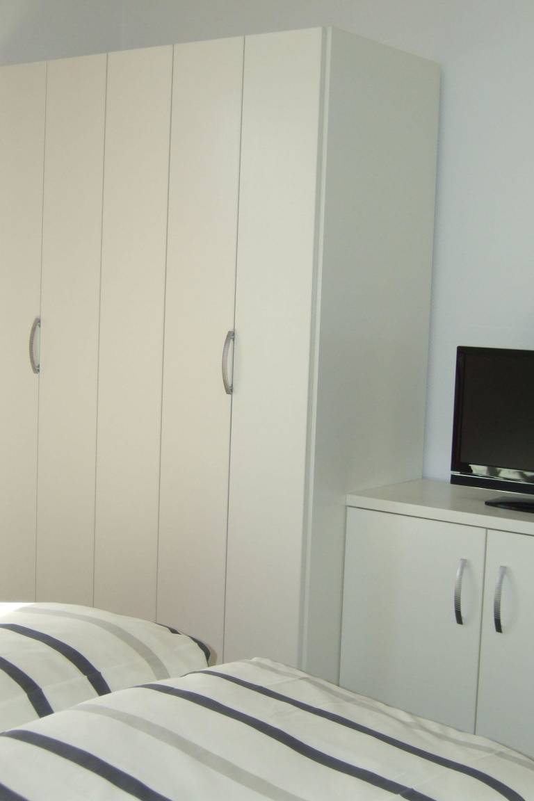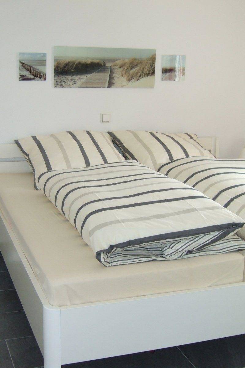 Im Wohlfühl-Modus bleiben Sie auch im hell eingerichteten Schlafzimmer. Im Doppelbett mit offenen Fußteil (1,80 m x 2,00 m) können Sie von Sonne, Strand und Meer träumen. Im Kleiderschrank sowie einer Kommode können Sie Ihre Habseligkeiten verstauen. Ein Fernseher und ein Wecker vervollständigen das Zimmer.