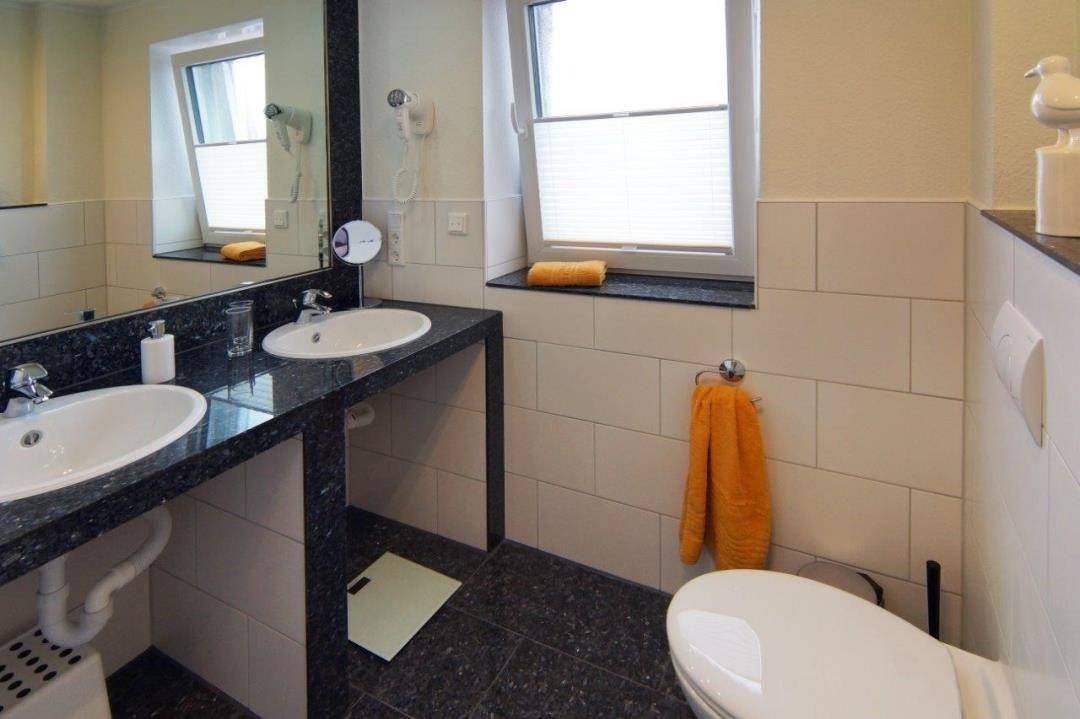 Das Badezimmer in schickem Design in Weiß und Granit bietet Ihnen mit seiner Fußbodenheizung ebenfalls ein besonders ansprechendes Ausstattungsniveau. Der praktische Doppelwaschtisch mit großem Spiegel, die Dusche mit Glastür sowie der bereitliegende Fön unterstreichen die komfortable Gestaltung des Bades.