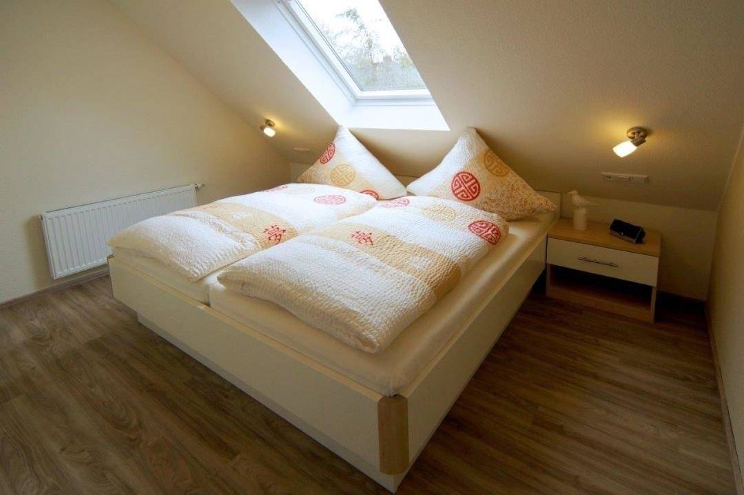 Auf der gleichen Ebene wie der Wohnraum befindet sich das erste Schlafzimmer der Wohnung. Mit einem Doppelbett möbliert eignet es sich hervorragend als Elternschlafzimmer. Über die Treppe erreichen Sie das Dachgeschoss, in welchem sich das zweite Schlafzimmer befindet. Dieses ist mit zwei Einzelbetten ausgestattet, die sich bei Bedarf auch zu einem Doppelbett zusammenstellen lassen.