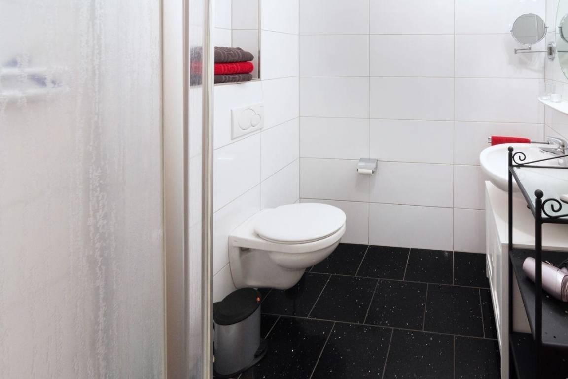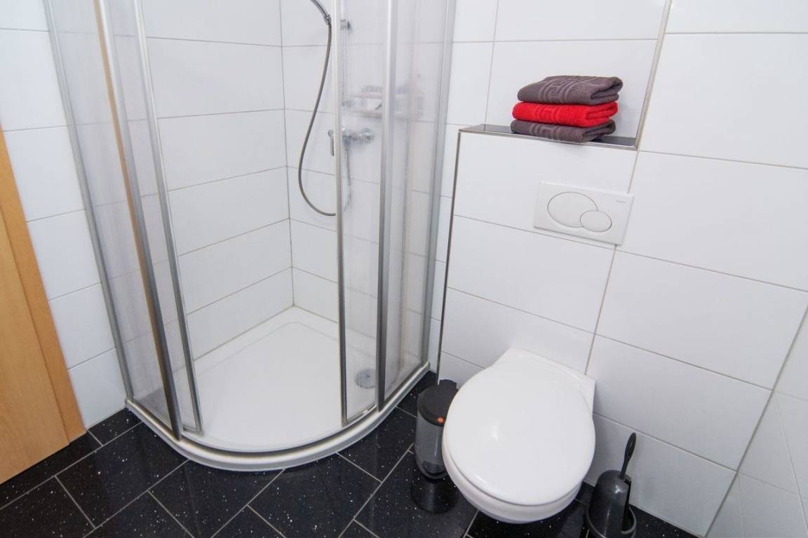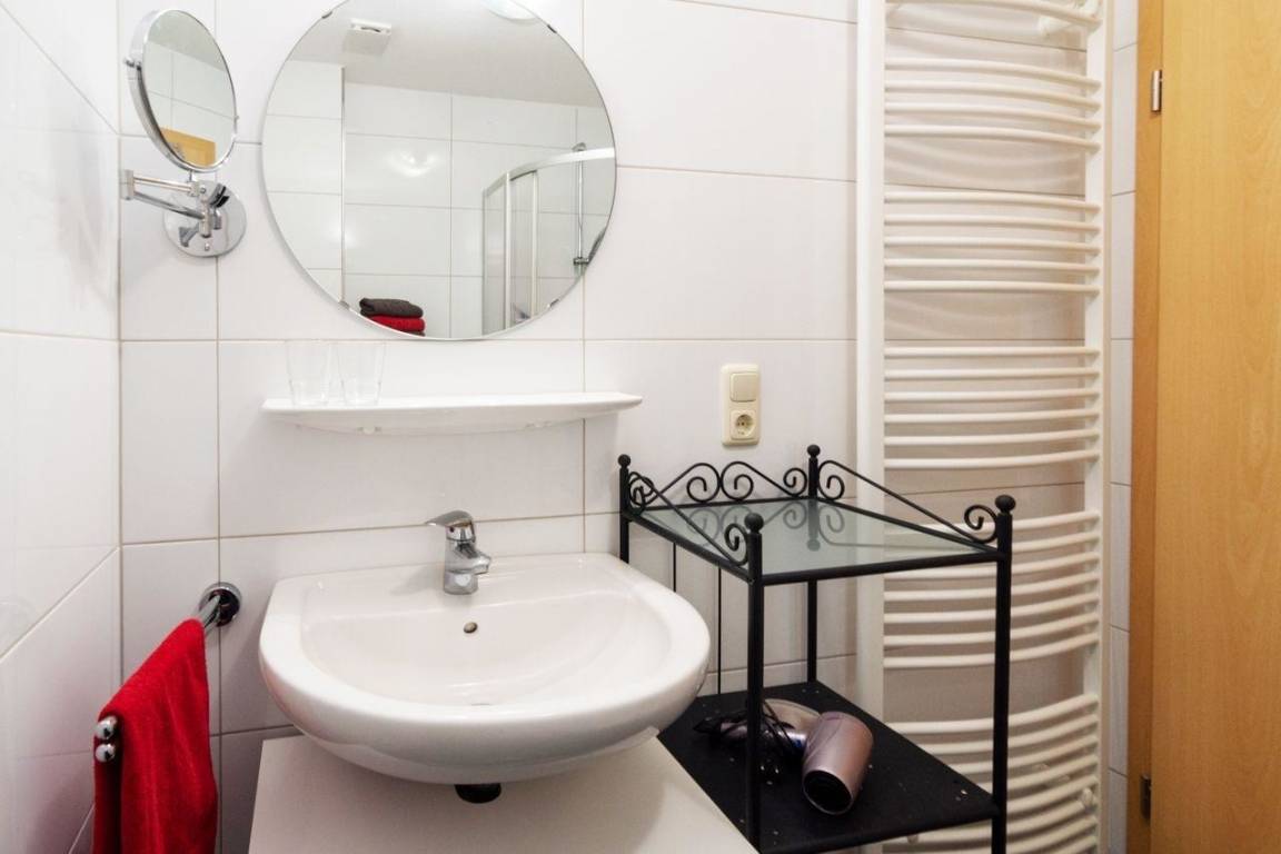 Das Badezimmer der Unterkunft präsentiert sich ebenso einladend und modern wie der Rest der Wohnung. Es handelt sich um ein Duschbad, welches durch ein WC, eine Waschkombination mit großem Spiegel und einen Föhn ergänzt wird.