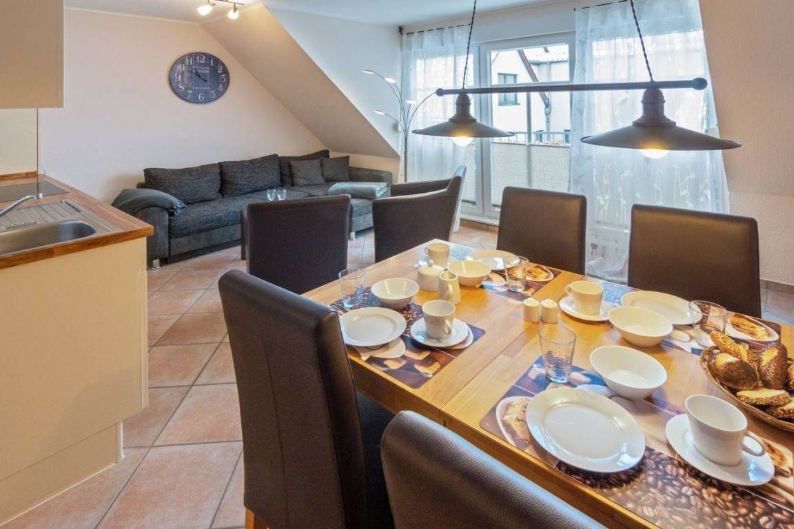 Herzstück der gemütlichen Ferienwohnung, in der Hunde herzlich willkommen sind, im ersten Obergeschoss ist der offen gestaltete Wohnraum mit integrierter Küche und Essplatz. Hier haben Sie ausreichend Platz zum Kochen, Essen und für entspannte TV-Abende.