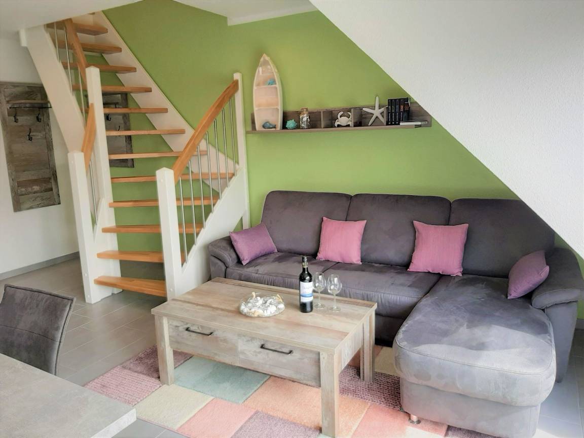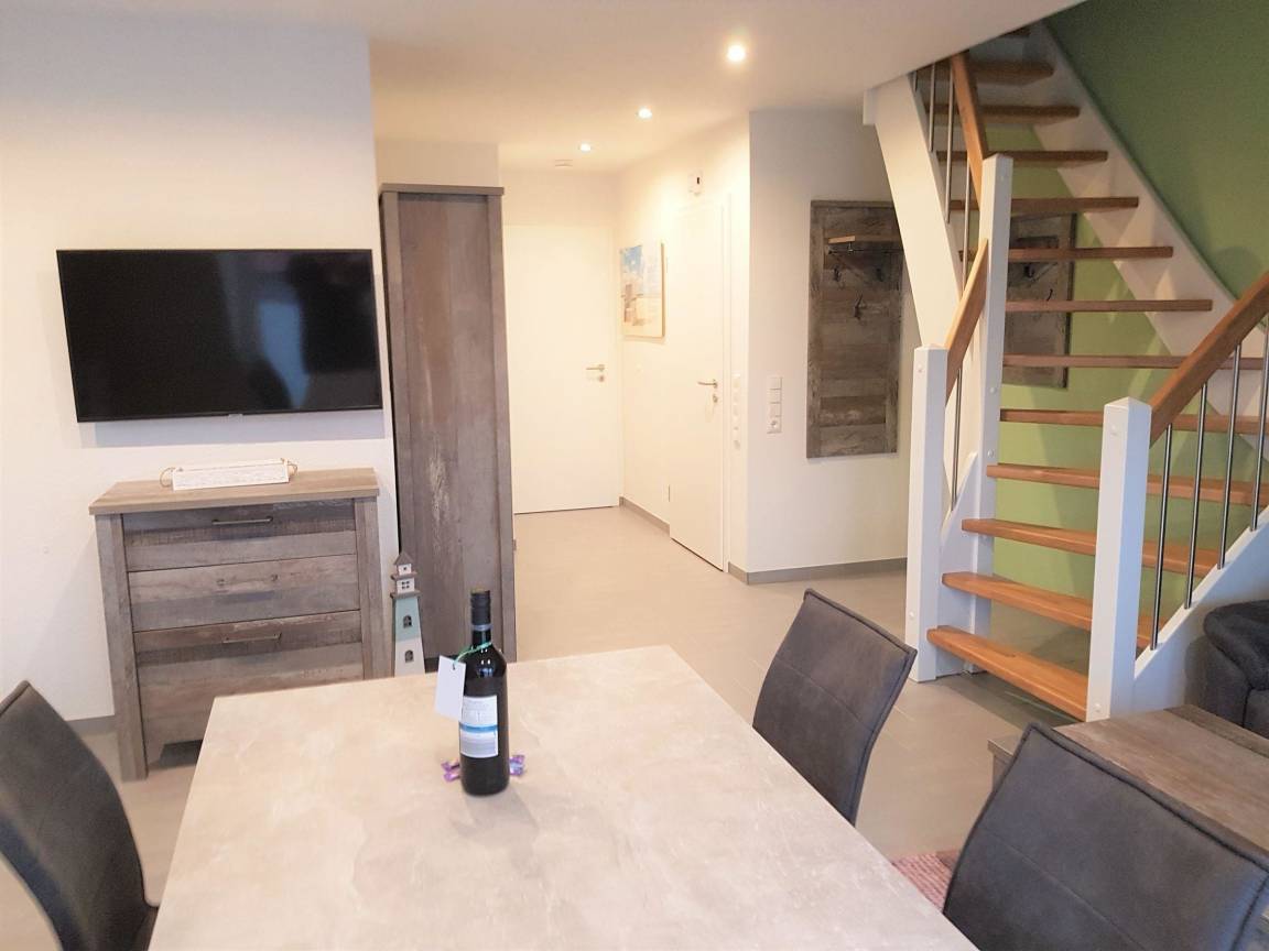 Das „Küstendomizil" ist eine moderne Nichtraucher-Ferienwohnung im 1. Obergeschoss, die Platz für bis zu 4 Personen bietet. Das helle Wohn-Esszimmer ist mit einem großen Smart-TV und einer Stereoanlage ausgestattet und lädt zum Entspannen ein. Die offene Küche verfügt über ein 4-Platten-Ceranfeld, Backofen, Spülmaschine und eine Vielzahl an Küchenutensilien. Zwei Schlafzimmer, beide mit Smart-TV und allergikerfreundlicher Bettwäsche, bieten einen erholsamen Schlaf. Das Duschbad ist mit einer ebenerdigen Regendusche, Föhn und vielen Ablageflächen ausgestattet. Zusätzlich gibt es ein separates WC im 2. OG.