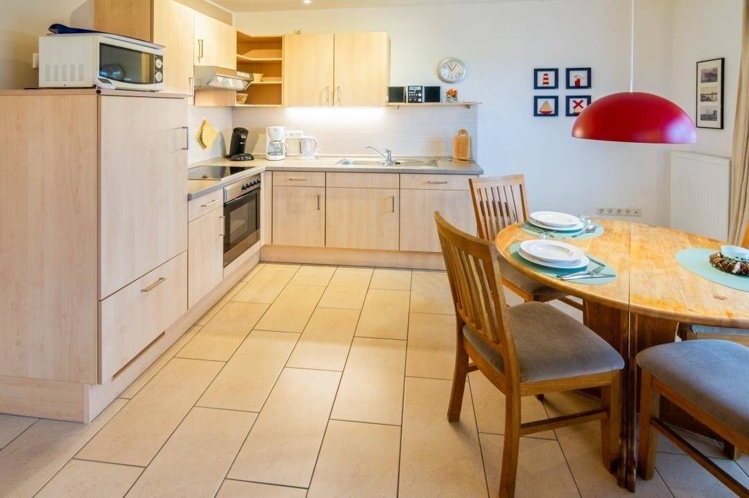 Der Wohnbereich ist großzügig gestaltet und umfasst eine bequeme Sitzgruppe mit hochwertiger Schlafcouch, einen Wohnzimmerschrank und einen 102 cm großen Flachbildfernseher mit Satellitenempfänger und HDTV. Die integrierte Küchenzeile ist gut ausgestattet mit Ceranherd, Kühlschrank, Gefrierfach, Mikrowelle, Spülmaschine, Kaffeemaschine, Wasserkocher, Mixer, Toaster, Eierkocher und Elektrogrill. Ein Essbereich mit Esstisch und bequemen Stühlen ist ebenfalls vorhanden. Die Wohnung verfügt über eine Heizung und eine Sofaecke mit Sofa und Sesseln.