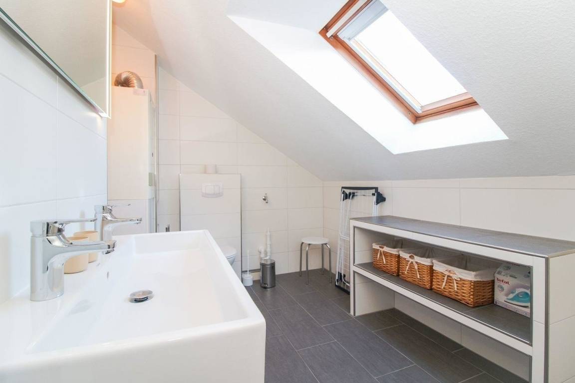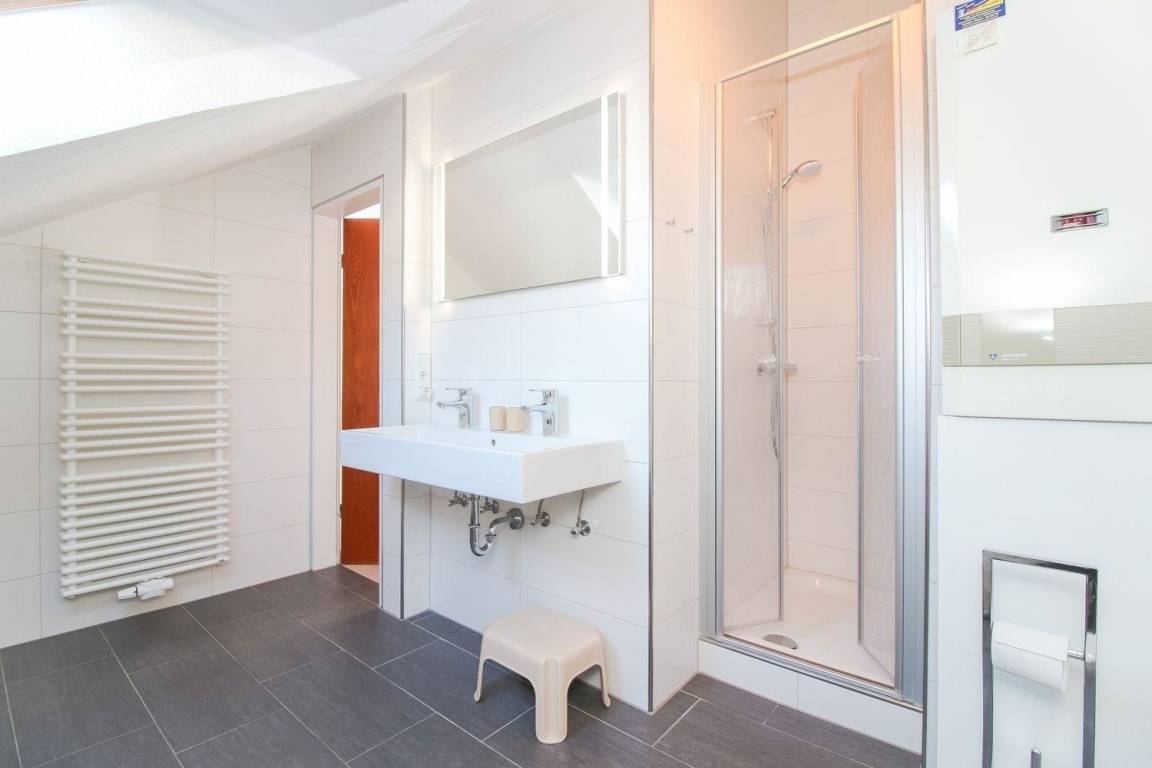 Im Obergeschoss befindet sich das große Tageslichtbad sowie das anliegende Schlafzimmer mit Doppelbett.