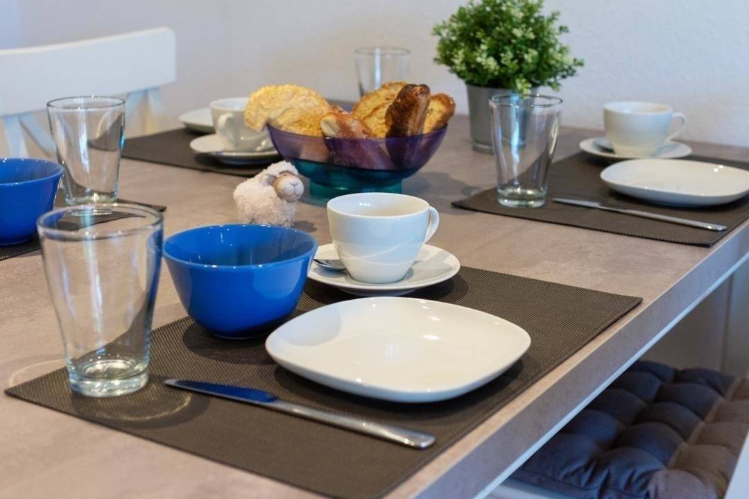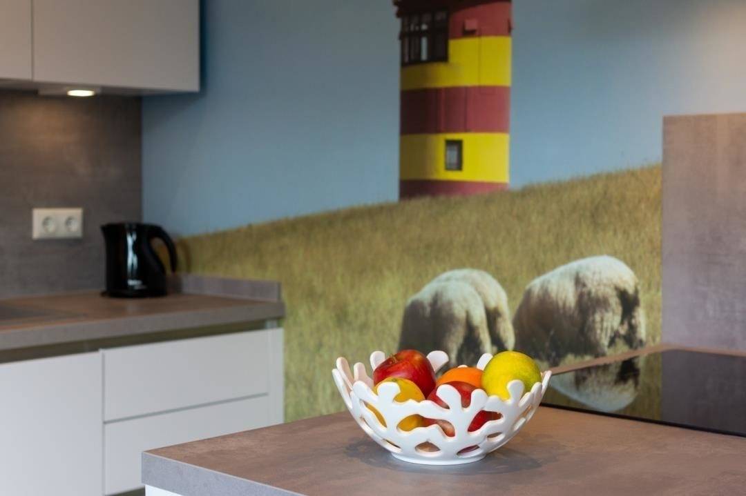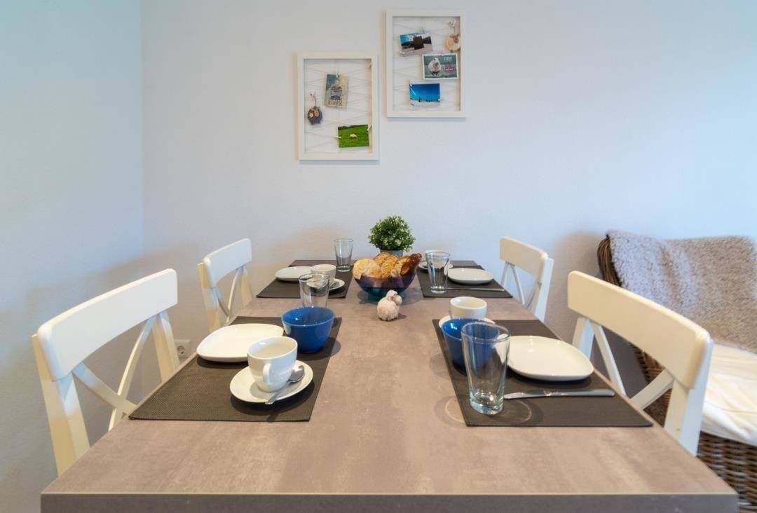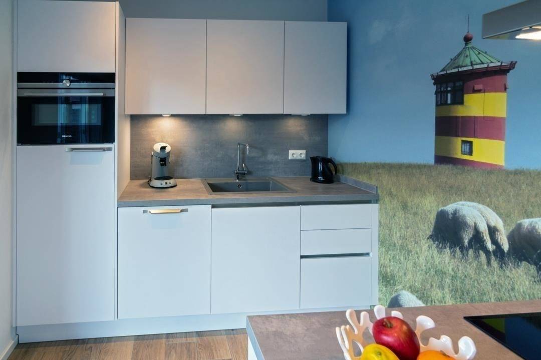 Die Küche ist modern und funktional eingerichtet. Die Küchenzeile wurde mit allem ausgestattet, was zum Kochen benötigt wird. So macht das Kochen auch im Urlaub Spaß. Hierzu zählt ein Backofen mit kombinierter Mikrowelle, ein Herd, eine Kaffeemaschine, eine Kaffee-Pad-Maschine, ein Kühlschrank, ein Geschirrspüler und nicht zu vergessen Toaster, Geschirr, Gläser, Becher etc. Die Küchennische schließt sich an den Wohn-Essbereich an.