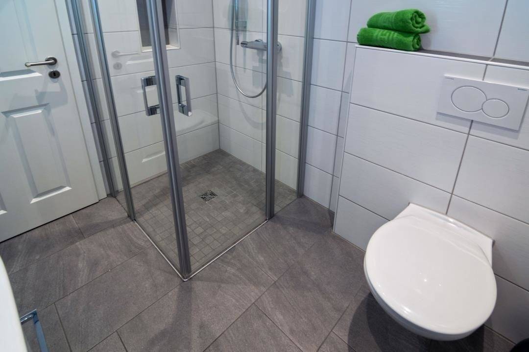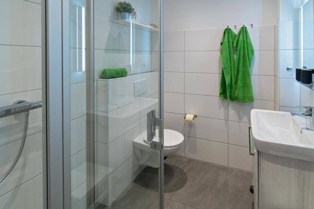 Auch das Bad lässt es an nichts fehlen. Es ist mit einer Dusche, einem WC, einer Waschkombination mit großem Spiegel, Föhn und Handtuchtrockner ausgestattet. Zudem steht im Abstellraum eine Waschmaschine bereit.
