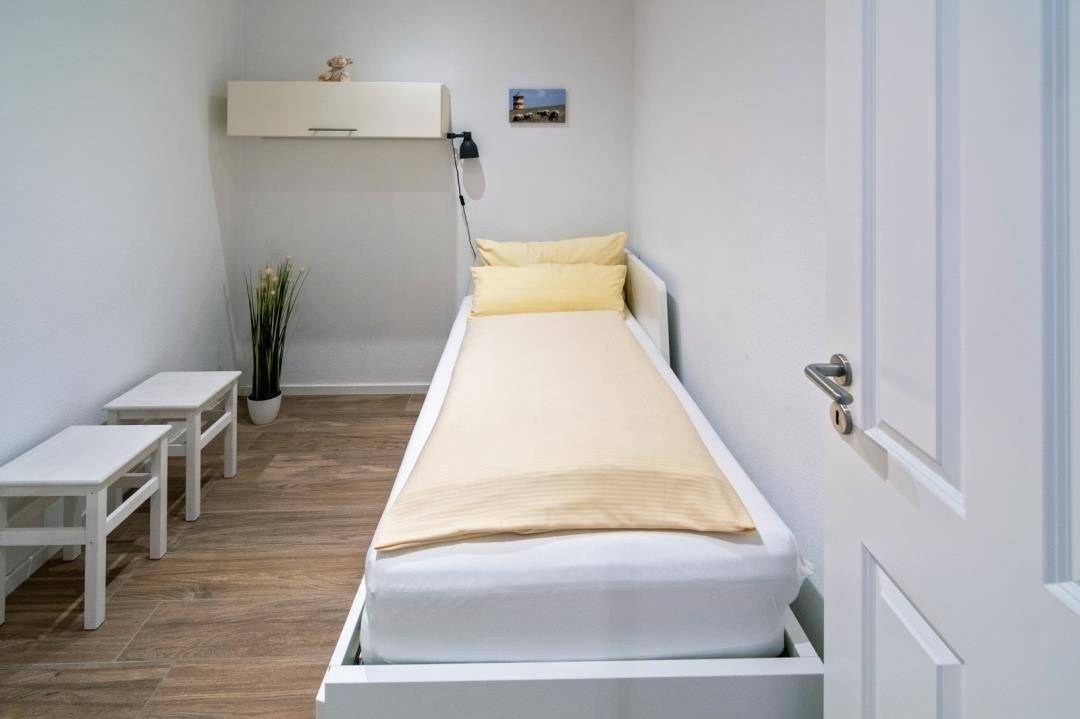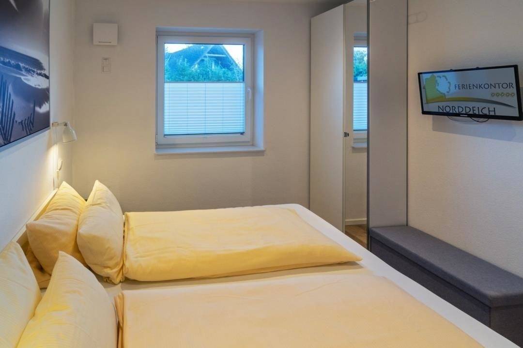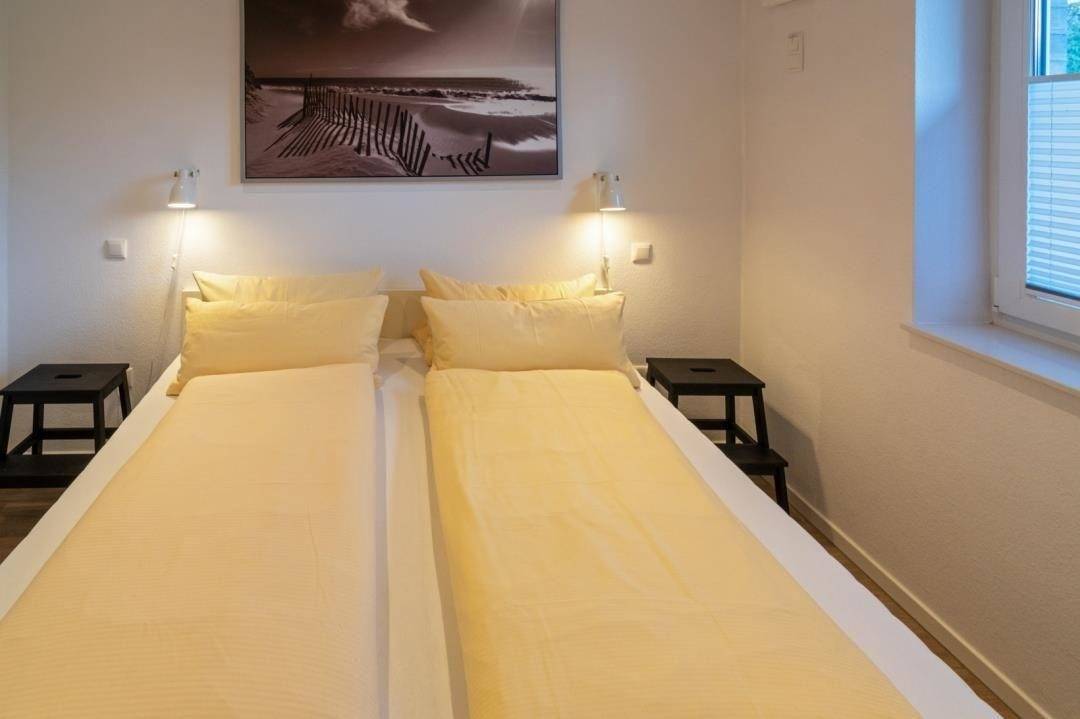 Die Ferienwohnung verfügt über zwei gemütlich eingerichtete Schlafzimmer. Das rechte Schlafzimmer hat ein 200 x 200 cm großes Doppelbett mit getrennten Matratzen. Ein Schrank bietet ausreichend Platz für Ihre Garderobe und ein TV-Gerät und eine Sitzbank komplettieren die Einrichtung. Das linke Schlafzimmer ist innenliegend und hat ein 90 x 200 cm großes Einzelbett, welches um ein weiteres 90 x 200 cm Bett ausziehbar ist.