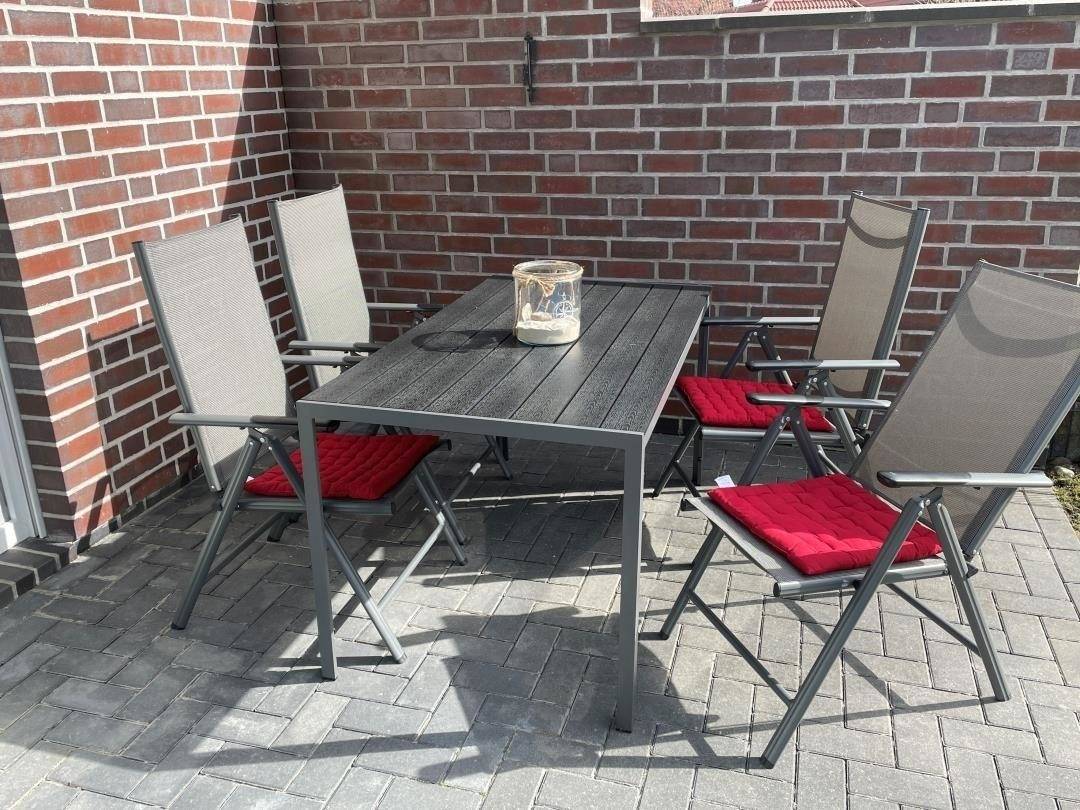 Genießen Sie an sonnigen und warmen Tagen die Terrasse und den angrenzenden Garten in südöstlicher Richtung. Eine Sitzgruppe mit Tisch und Stühlen steht im Außenbereich für Sie bereit. Der gesamte Garten ist eingezäunt und ist somit auch für Kleinkinder geeignet.