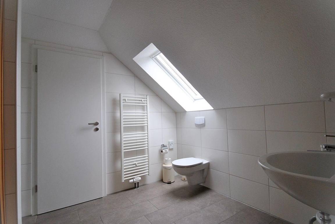 Tageslichtbad mit WC, ein Urinal, eine ebenerdige Dusche mit Echtglastüren sowie ein Handtuchheizkörper und Föhn.