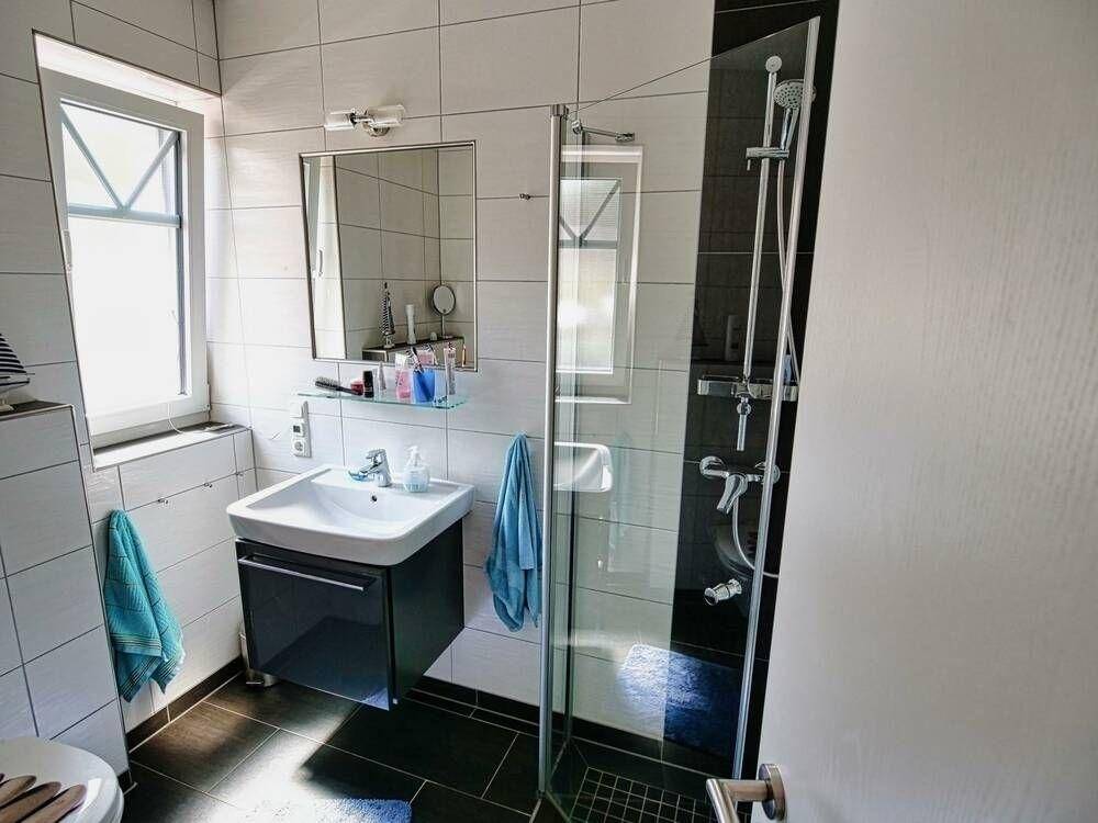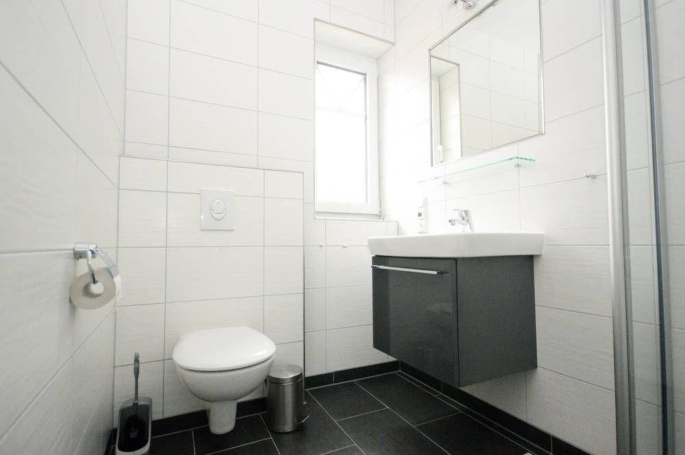 Unser Bad mit Tageslicht verfügt über eine große ebenerdige Eckdusche, einen Handtuchheizkörper, einen Waschtisch mit Unterschrank sowie einen Fön und einen Kosmetikspiegel.