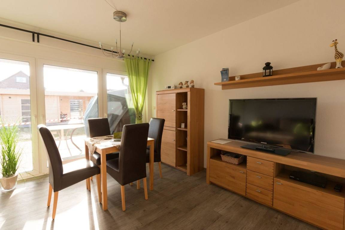Die Ferienwohnung „Dat Ferienhus Norddeich" ist eine modern eingerichtete Erdgeschosswohnung mit einer Wohnfläche von 45 m², die Platz für bis zu 4 Personen bietet. Sie verfügt über ein Wohnzimmer mit Essbereich, einer gut ausgestatteten Küchenzeile sowie ein Schlafzimmer mit Doppelbett und einem großen Fernseher. Das Tageslicht-Badezimmer ist mit einer Dusche ausgestattet. Für zusätzliche Schlafmöglichkeiten steht eine ausziehbare Doppelschlafcouch zur Verfügung. Die hochwertige Küchenausstattung umfasst einen Kühlschrank mit Gefrierfach, eine Mikrowelle, einen Geschirrspüler und weitere Kochgeräte. Die Wohnung bietet kostenloses WLAN und eine Reihe von Unterhaltungsmöglichkeiten, einschließlich eines 4K-Smart-TVs. Außerdem sind Rollläden zur Verdunkelung vorhanden. Bettwäsche und Handtücher können gegen Aufpreis gebucht werden. Hunde sind willkommen, Katzen jedoch nicht gestattet.