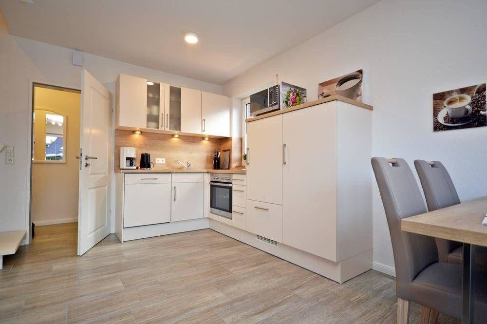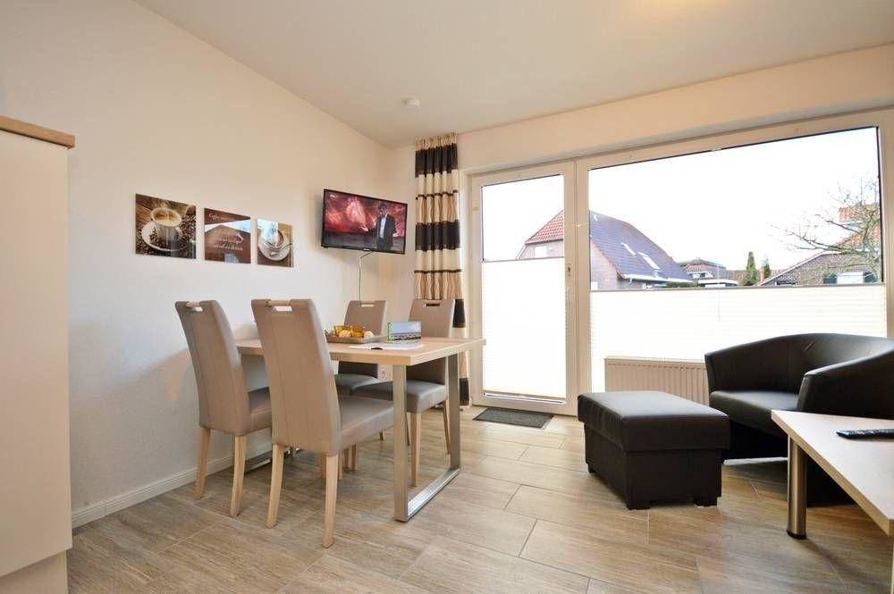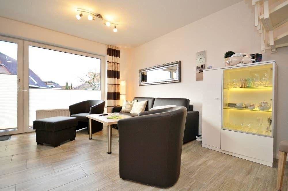 Hereinspaziert in diese hochwertig ausgestattete Ferienwohnung. Im hellen Wohn-/Esszimmer, mit direktem Zugang zur Terrasse, finden Sie eine gemütliche Ledergarnitur und Sessel für nette Fernsehabende. Bei einer Belegung mit drei/vier Personen wird diese zur Schlafgelegenheit.