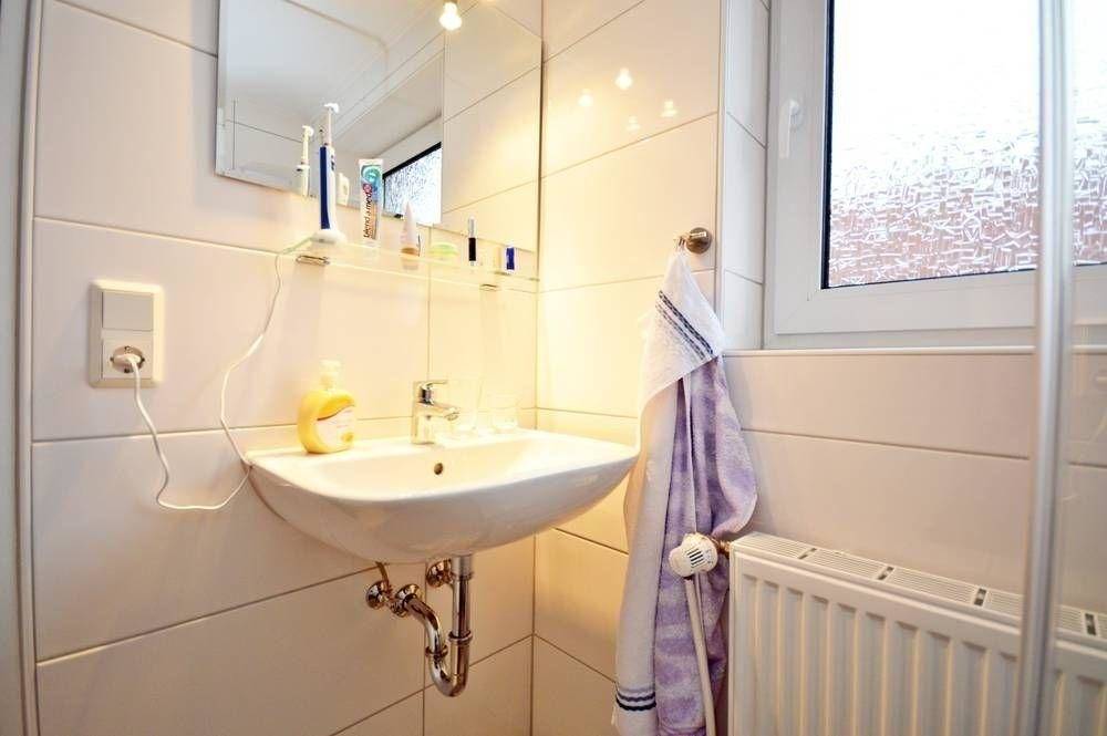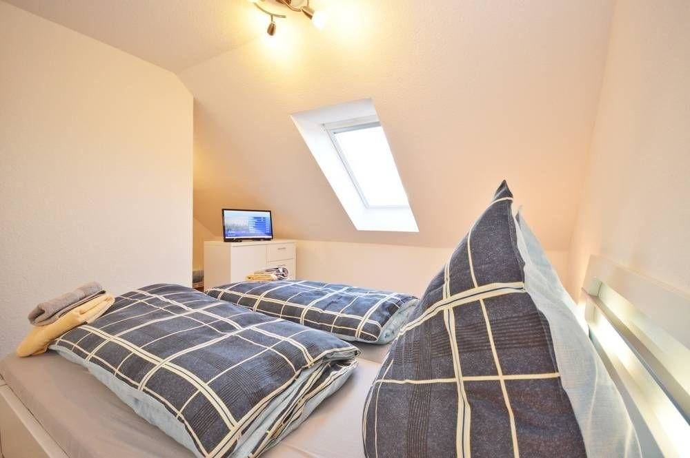 Im Obergeschoss haben Sie Diele, das Schlafzimmer mit Doppelbett, Schrank und TV sowie das Badezimmer mit einer sehr flachen Duschwanne und Echtglastüren.