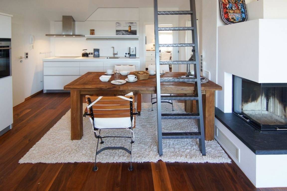Das Apartment bietet einen loftartigen, großzügig geschnittenen Wohnbereich, der Funktionalität und Luxurösität in ansprechender Weise kombiniert. Wohn- und Essbereich sind dabei bewusst komfortabel gestaltet. Die exklusive Einbauküche der Marke „Bulthaupt" rundet die repräsentative offene Gestaltung des Lofts ab. Besonders exklusiv ist der Parkettfußboden aus Walnussholz, der ebenfalls einen sehr luxuriösen Charakter besitzt. Die breite Fensterfront sorgt für den perfekten Lichteinfall. Dank der modernen Fußbodenheizung ist zu jeder Jahreszeit Behaglichkeit garantiert. Darüber hinaus verfügt das Apartment auch über einen Kamin, in dem sich bei ungemütlicher Witterung schnell ein wärmendes Feuer entzünden lässt.