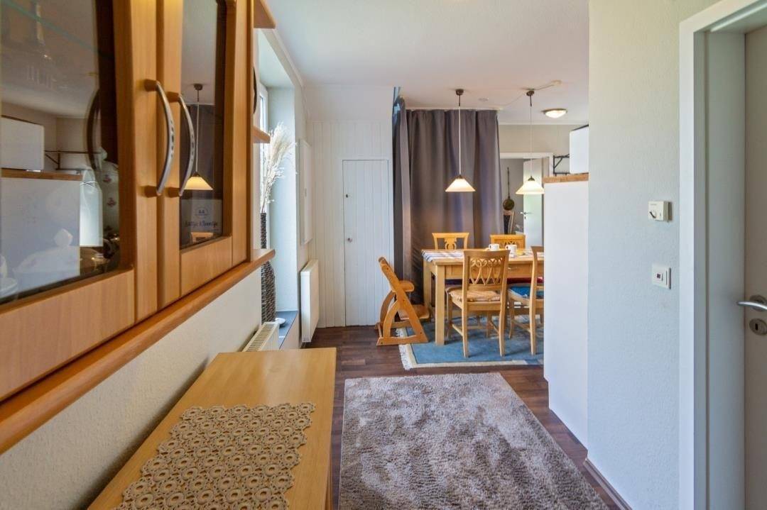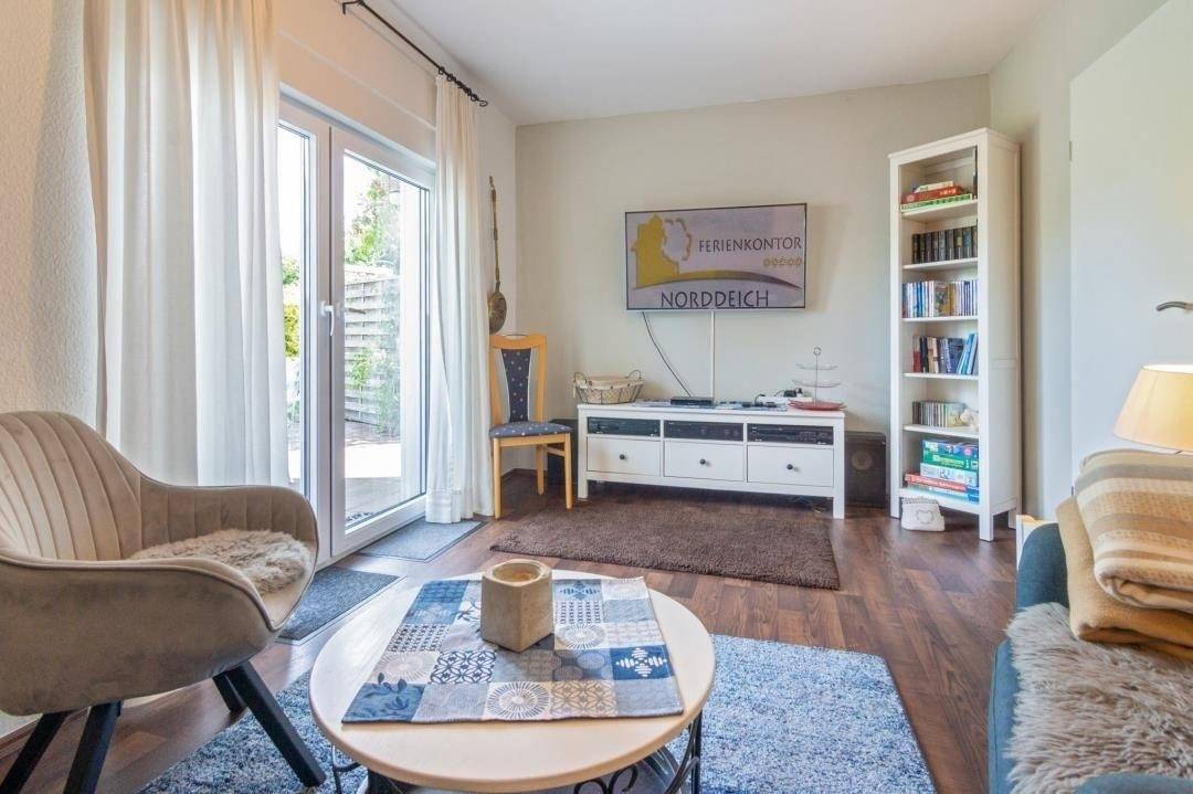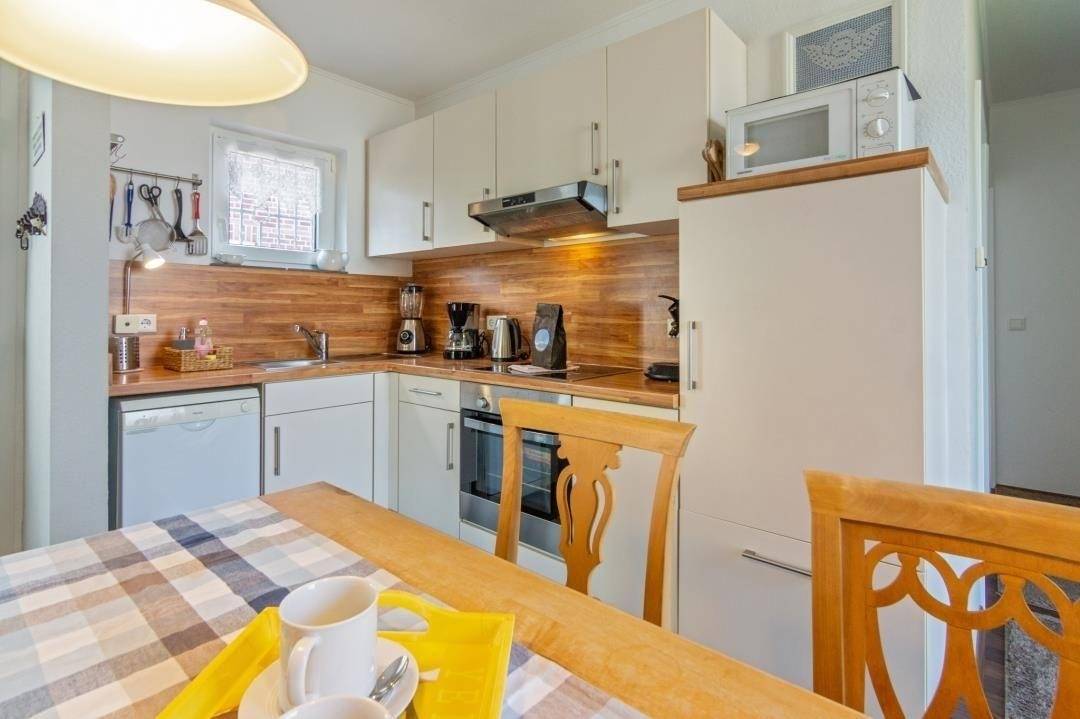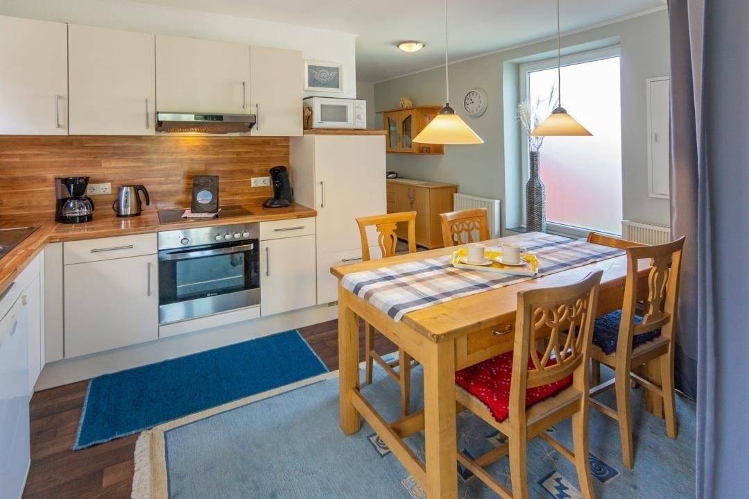 Im Wohnbereich erwartet Sie eine gemütliche Einrichtung mit verschiedenen Sitzmöglichkeiten, einem Fernseher, Blue-Ray-Player und einem gefüllten Bücher- und Spieleregal. Große Fenster zur Terrasse sorgen für viel Tageslicht und eine helle, freundliche Raumwirkung. Die Küche ist vollständig ausgestattet und verfügt unter anderem über Herd, Backofen, Mikrowelle, Toaster, Standmixer und Kaffee- sowie Senseomaschine. Am massiven Gesindetisch findet sich Platz für 4-6 Personen.