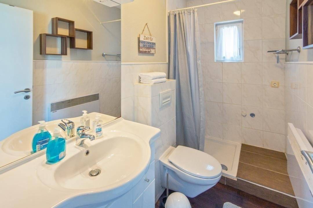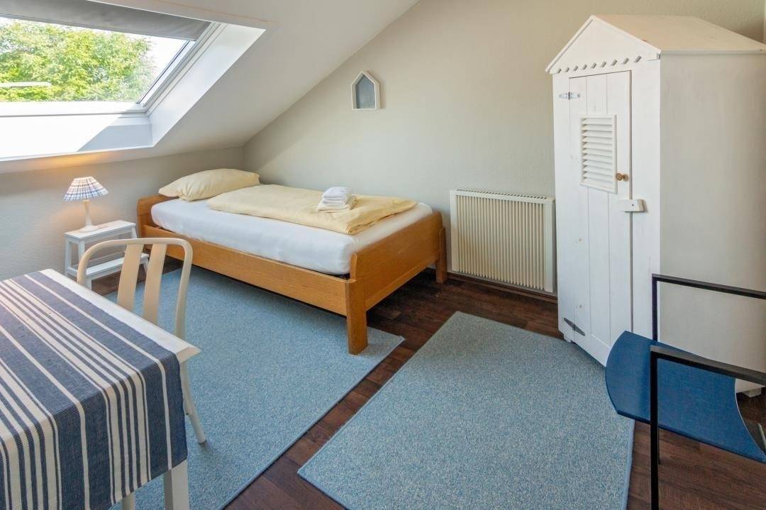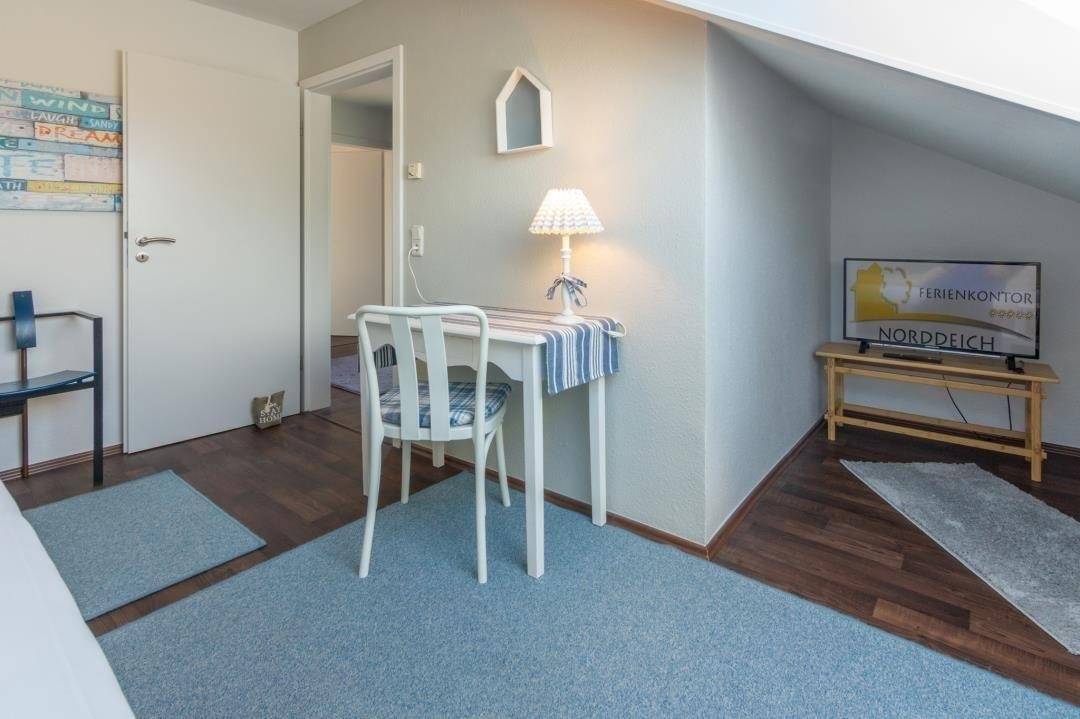 Die beiden Badezimmer sind zwar klein, aber funktional und jeweils mit Waschbecken, Dusche und WC ausgestattet. Für Ihre Erholung stehen insgesamt drei Schlafzimmer zur Verfügung: eines mit Doppelbett (180 x 200 cm), eines mit zwei Einzelbetten (je 90x 200 cm) und eines mit einem Einzelbett (100x200 cm) und eigenem Fernseher –ideal als Rückzugsort oder Kinder- bzw. Jugendzimmer. Ein Hochstuhl und ein Kinderreisebett inklusive Extra-Matratze sind ebenfalls vorhanden, sodass auch kleine Gäste bestens versorgt sind. WLAN ist selbstverständlich in der gesamten Wohnung verfügbar, und vor dem Haus finden sich auf der Straße immer Parkmöglichkeiten für eine bequeme Anreise mit dem Auto. Norden – Nordsee erleben mit Charme.