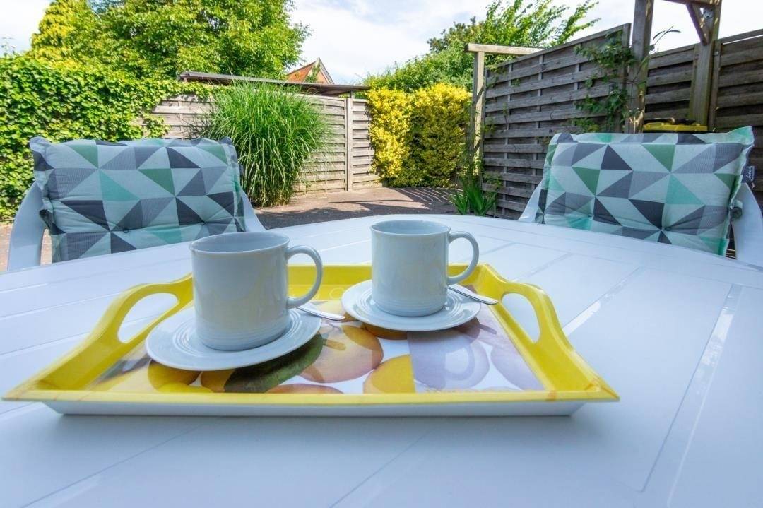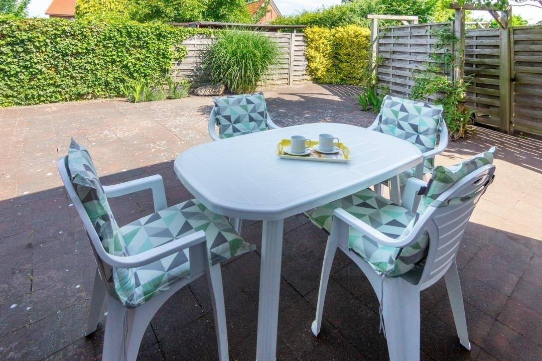 Im Außenbereich lädt eine Terrasse mit nordwestlicher Ausrichtung zum Verweilen ein. Hier stehen Ihnen Gartenmöbel und Liegen zur Verfügung. Fahrräder können sicher im Abstellschuppen untergebracht werden.
