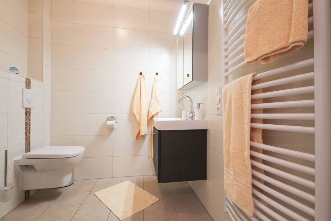 In der ganzen Wohnung ist Fußbodenheizung. Mit der vorhandenen Waschmaschine, Bügelbrett und Bügeleisen halten Sie Ihre Wäsche in Ordnung.