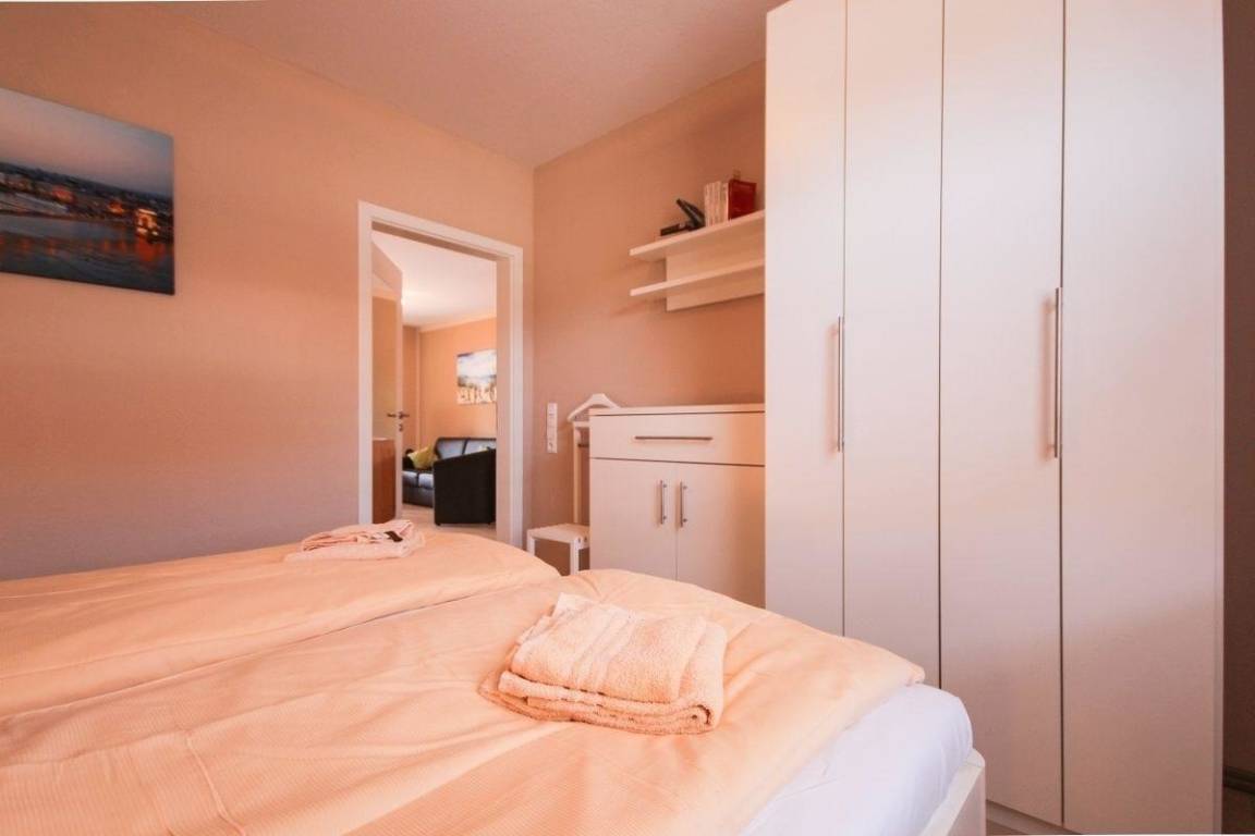 Das Schlafzimmer ist mit weißen Möbeln eingerichtet. Es besteht aus ein Doppelbett ohne Fußteil (1,80 x 2,00 m), Kleiderschrank, Kommode und Herrendiener.