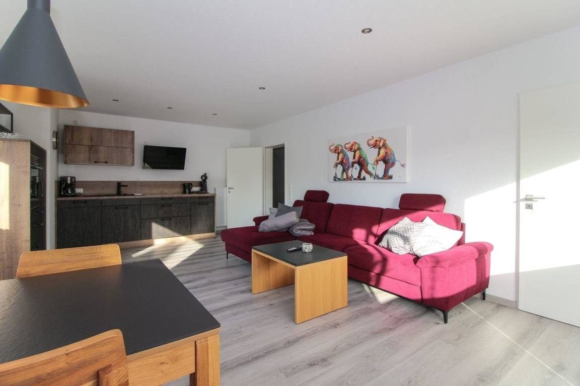 Das offene Wohnzimmer teilt sich seinen Platz mit einem Essbereich und der neuen Küchenzeile. Von hier aus gelangen Sie direkt in den Garten.