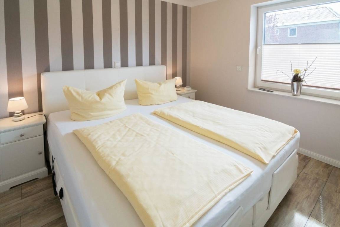Im Schlafzimmer können es sich die Gäste auf einem Boxspringbett gemütlich machen. Selbstverständlich sind ausreichend Stauräume in den Kleiderschränken und Kleiderbügel vorhanden. Bei Bedarf steht Ihnen ein Baby-Reisebettchen zur Verfügung, das hier ausreichend Platz findet.